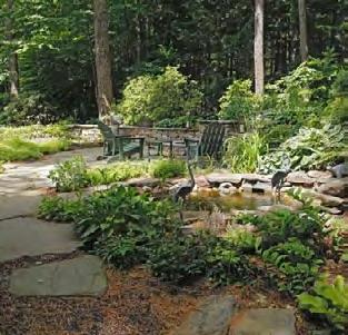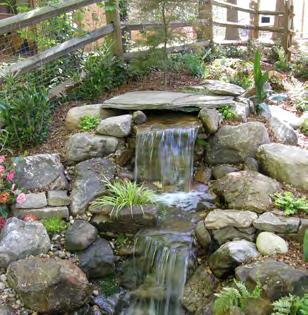 ARTIFICIAL WATERFALL TERRACED VEGETATED SEATING WOODLAND COURTYARD