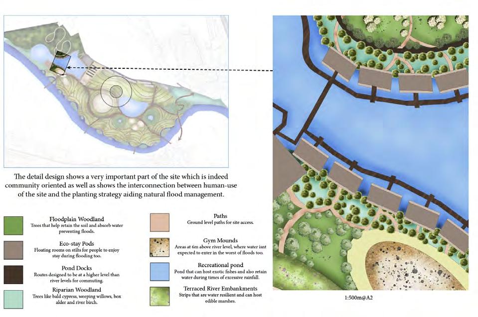 The site is a floodplain site victimized of flooding. The design brief was to find a solution for the current and future climate change.