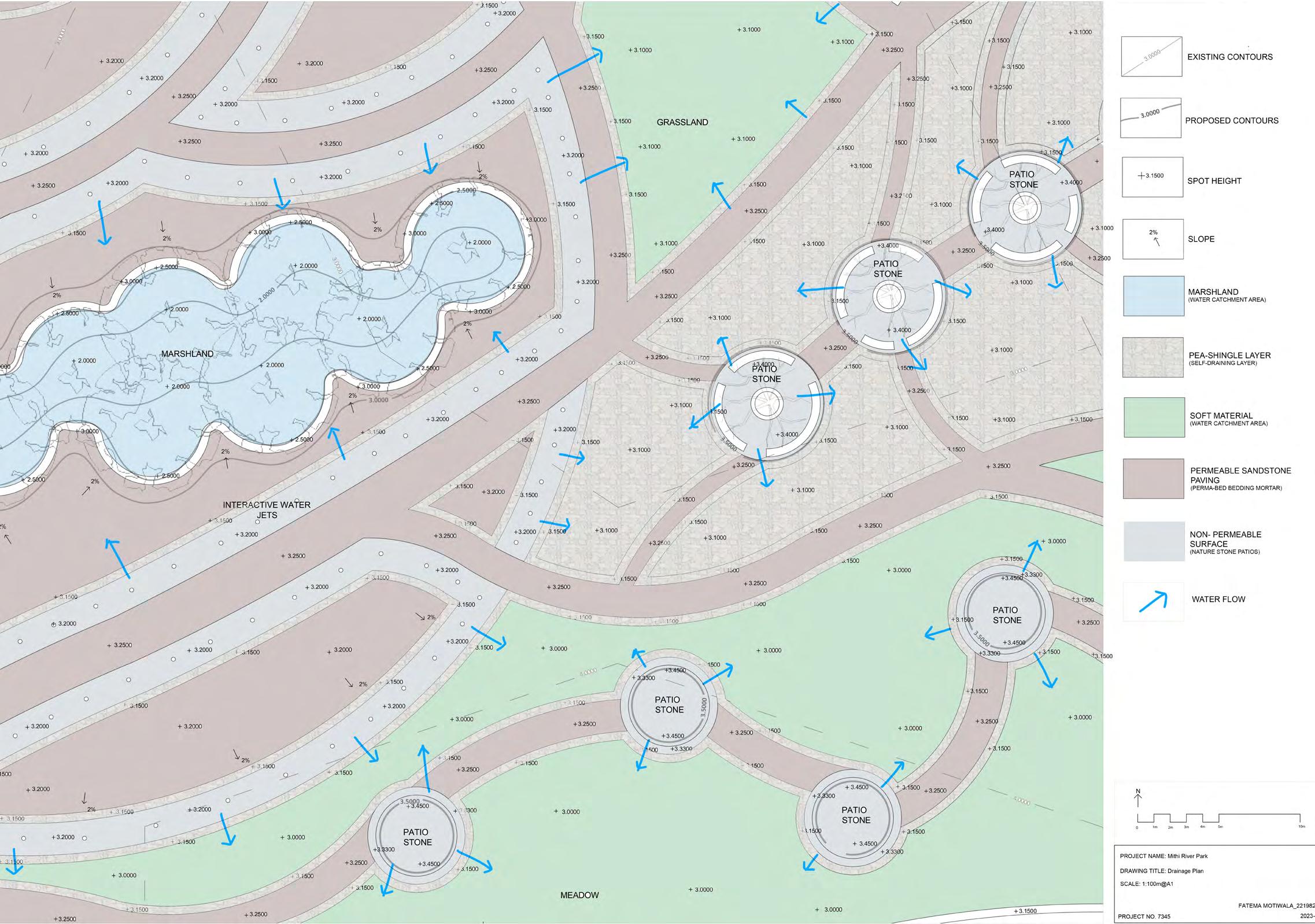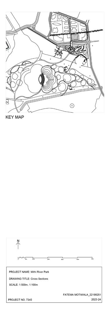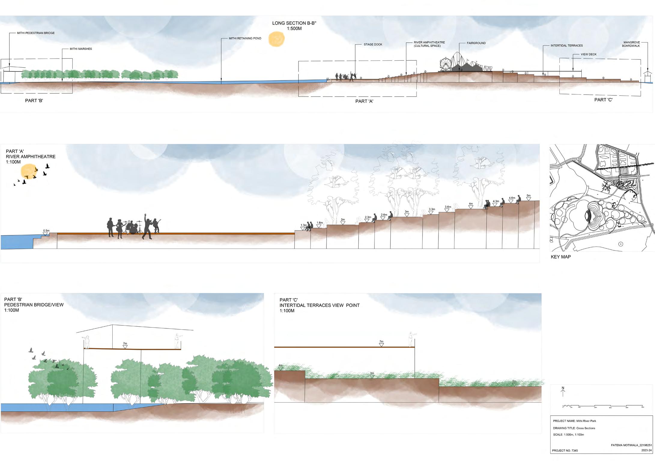 This long section shows the elevation change right from the Mithi pedestrian bridge to the intertidal terraces. It covers a critical section where the level first rises with each amphitheatre step and the fairground being the highest point. The level then gradually drops back to the river level with the dropping intertidal terraces. The design is meant to be submergable and permeable.