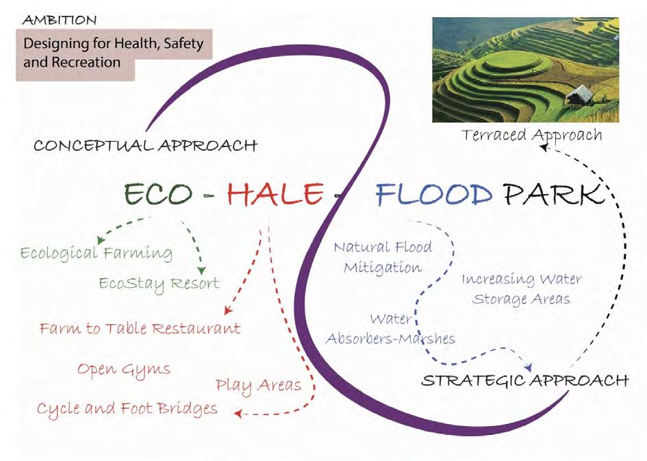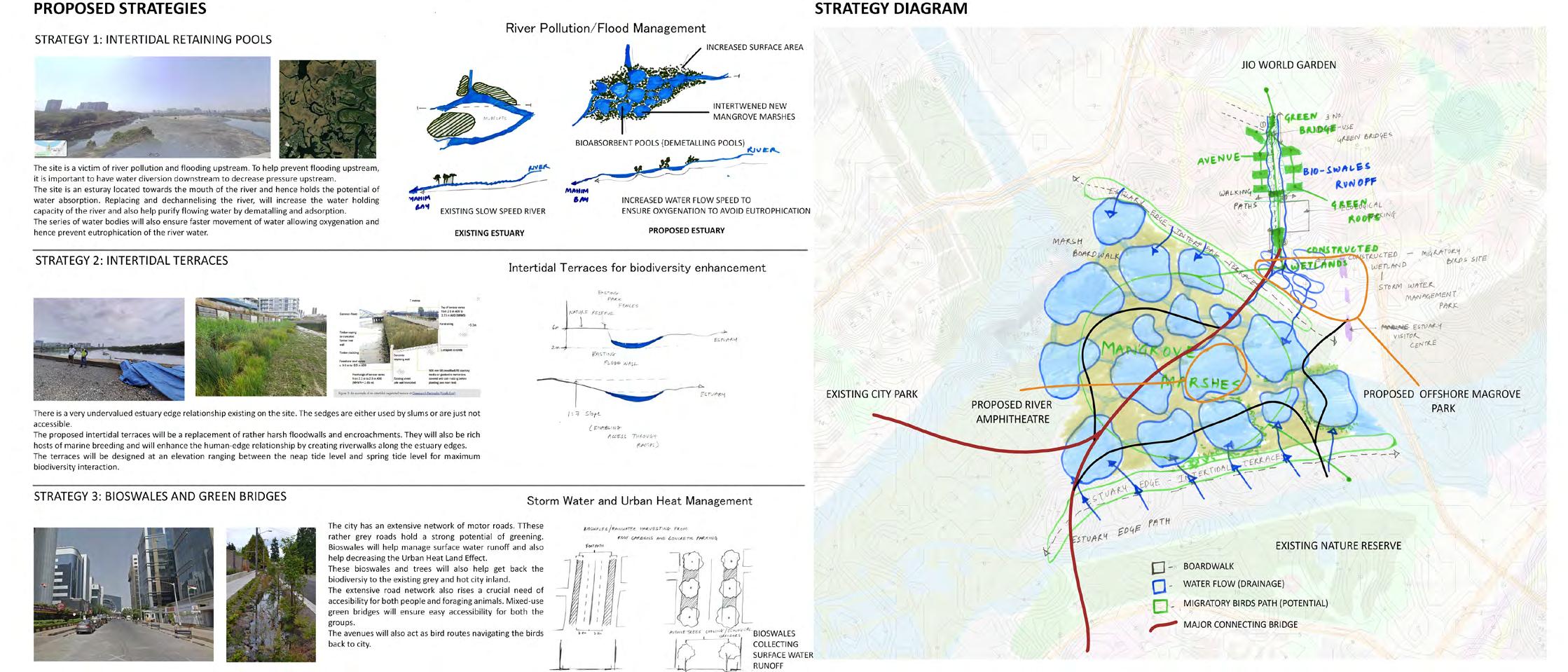 nature-based strategies like inter tidal terraces as natural flood barriers, water cleansers and potential breeding grounds for the marine ecology. the sponge-like terrain to soaks high amount of water during extreme rainfall events downstream thereby relieving the water pressure upstream