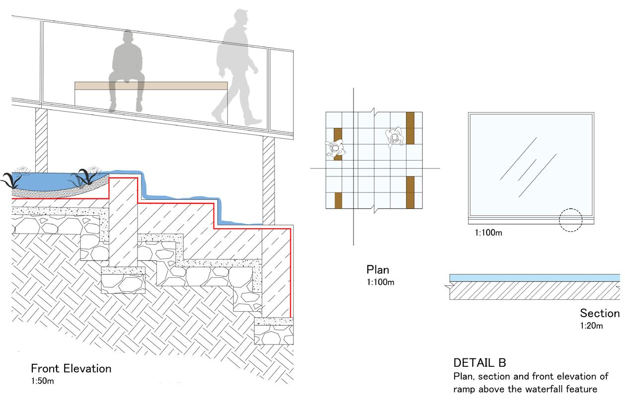 PLAN, SECTION AND FRONT ELEVATION OF RAMP RUNNING ABOVE THE PROPOSED WATERFALL FEATURE