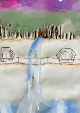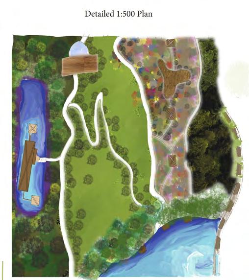 This is a visualization showing how people will use this part of the site in two different situations. As we are designing for climate change, the main scenario that will effect the site will be flooding. Hence, scenarios of flooding situation has been shown. The visualization below shows times of heavy rainfall event, when the site is expected to have water in the retaining ponds. The eco stay houses can be accessed using the stilted pond docks. These pond docks can alternatively be used for fishing too.