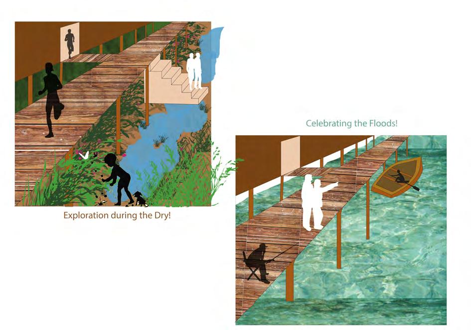 This first scenario shows the site use during the dry-80% of the all times. The dry grounds can then be used as play grounds or for camping or even hosting events like cultural shows and weddings too.