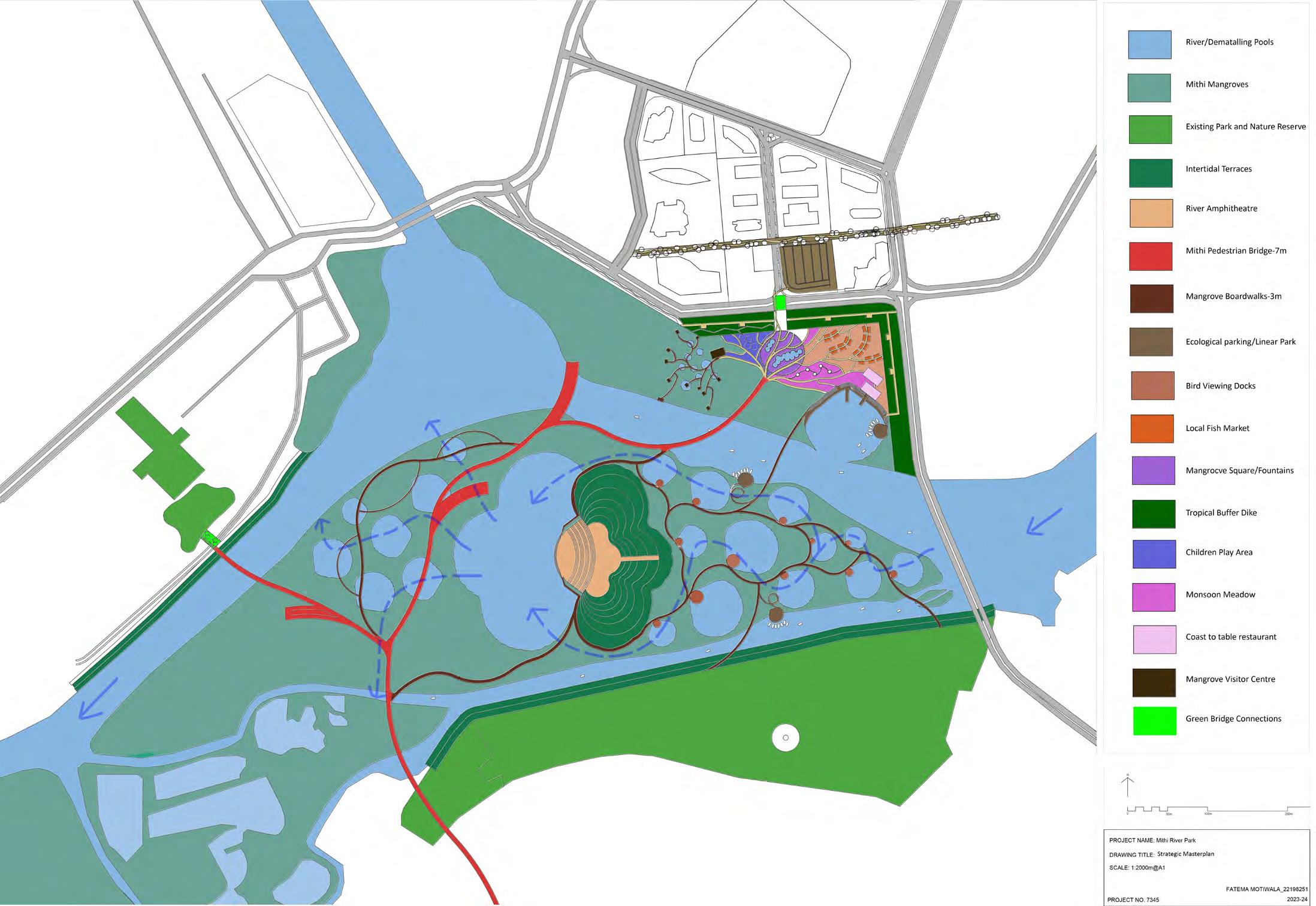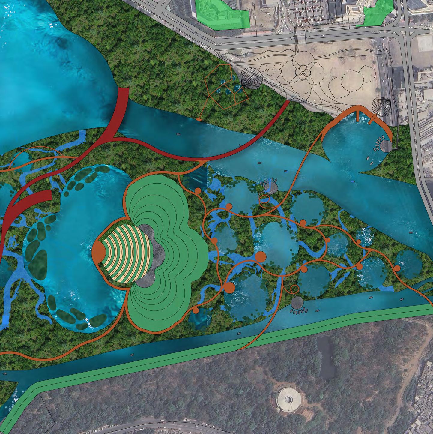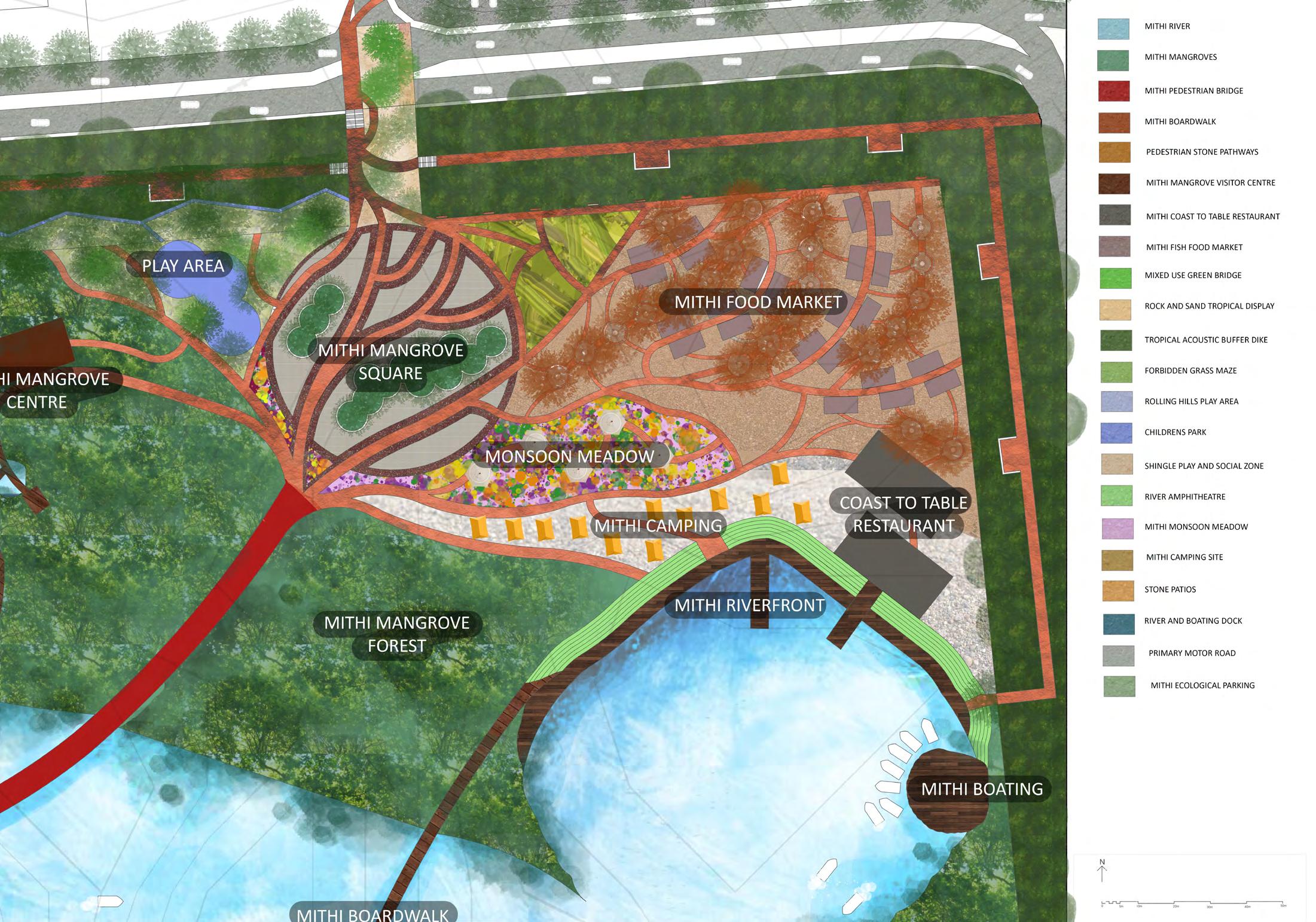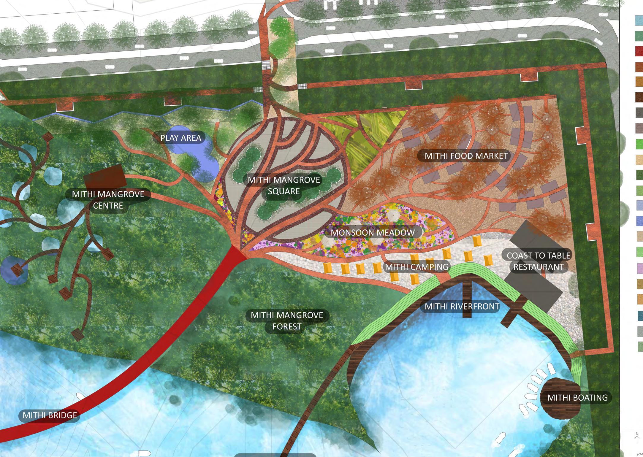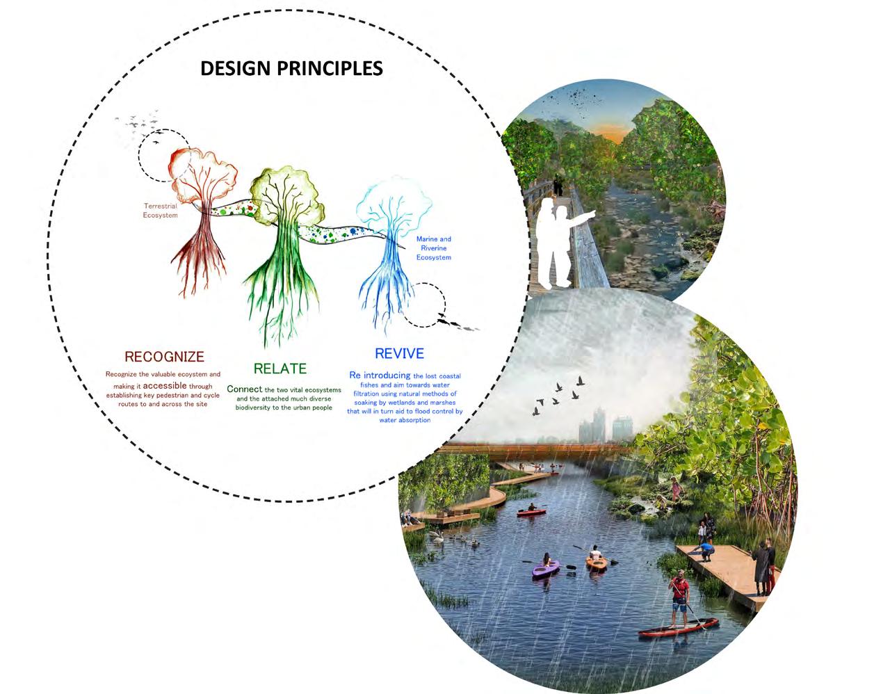 recognizes the river’s pollution from untreated sewage and chemical release from encroachments and proposes a series of dematalling ponds inter weaved with the mangroves to purify the river water by adsorption before draining it into the sea