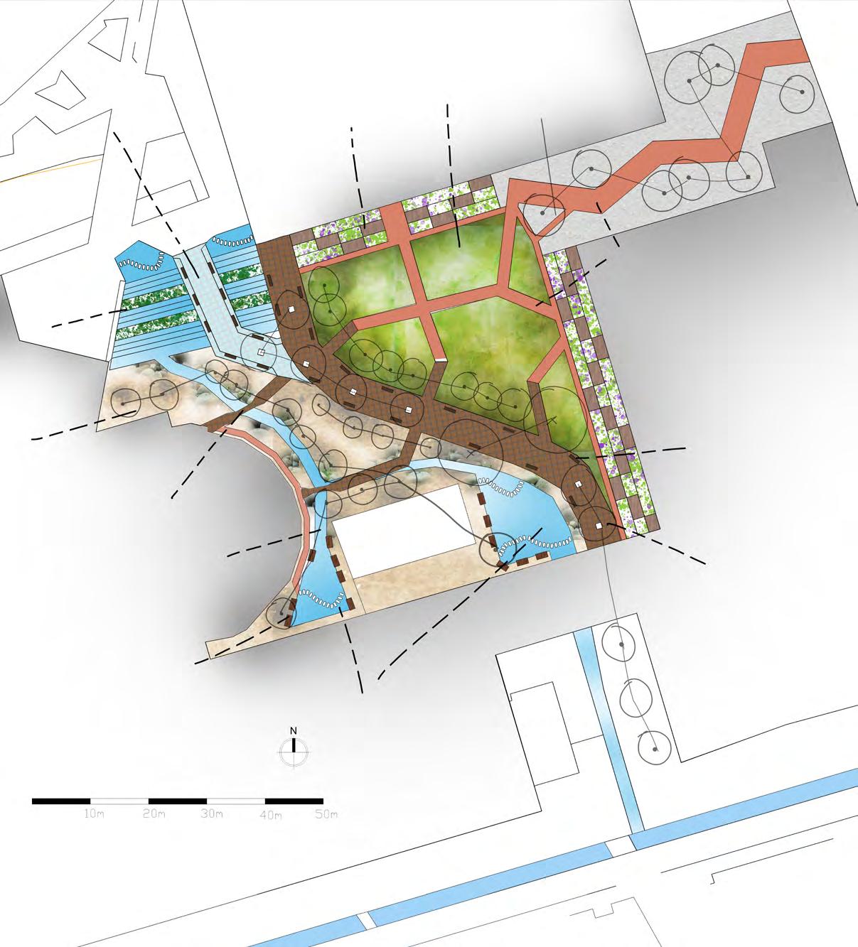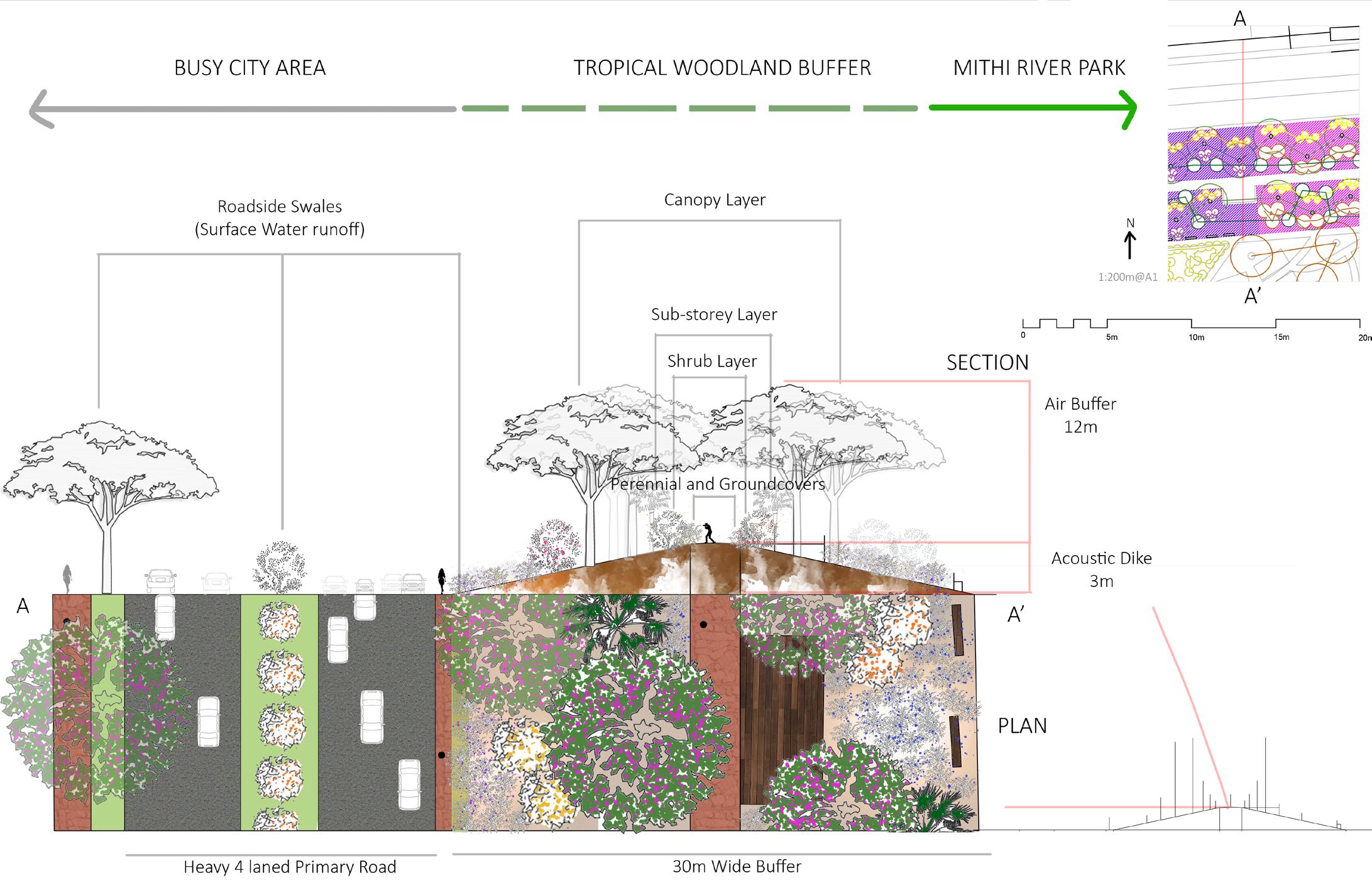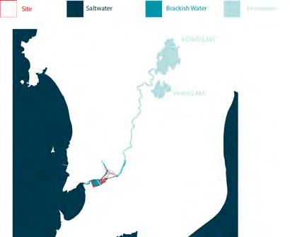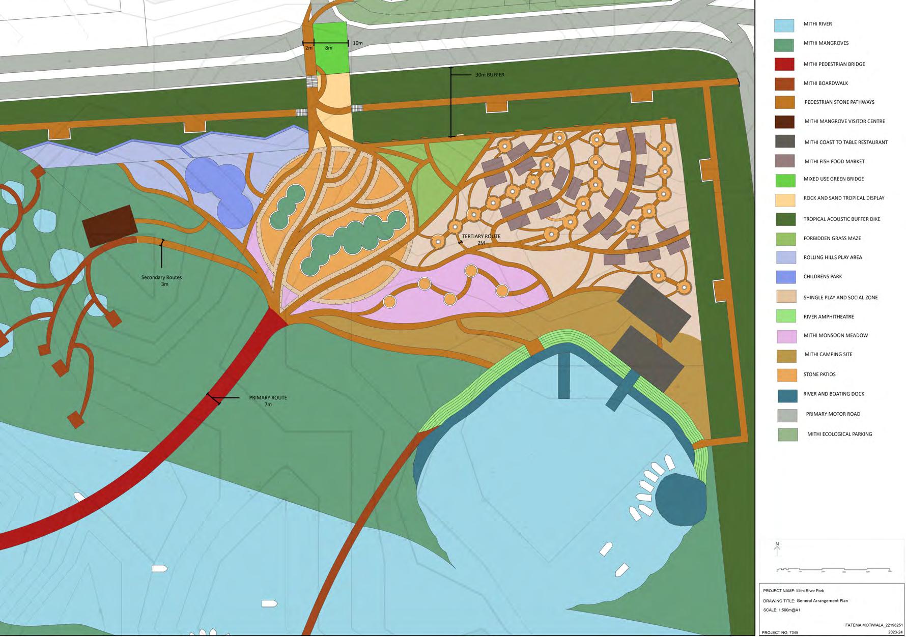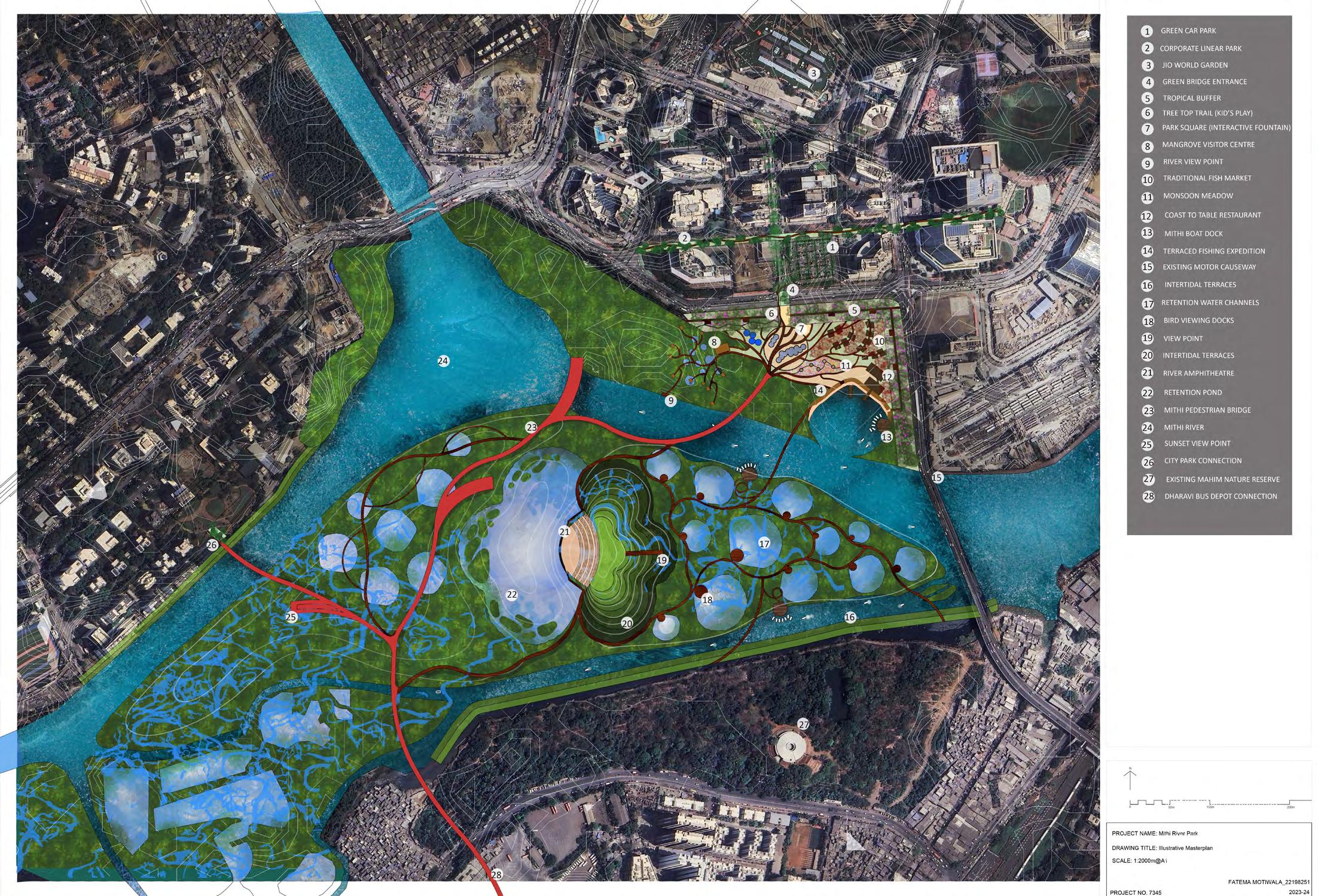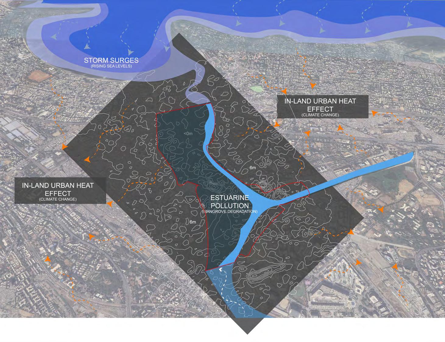 recognizes the river’s pollution from untreated sewage and chemical release from encroachments and proposes a series of dematalling ponds inter weaved with the mangroves to purify the river water by adsorption before draining it into the sea