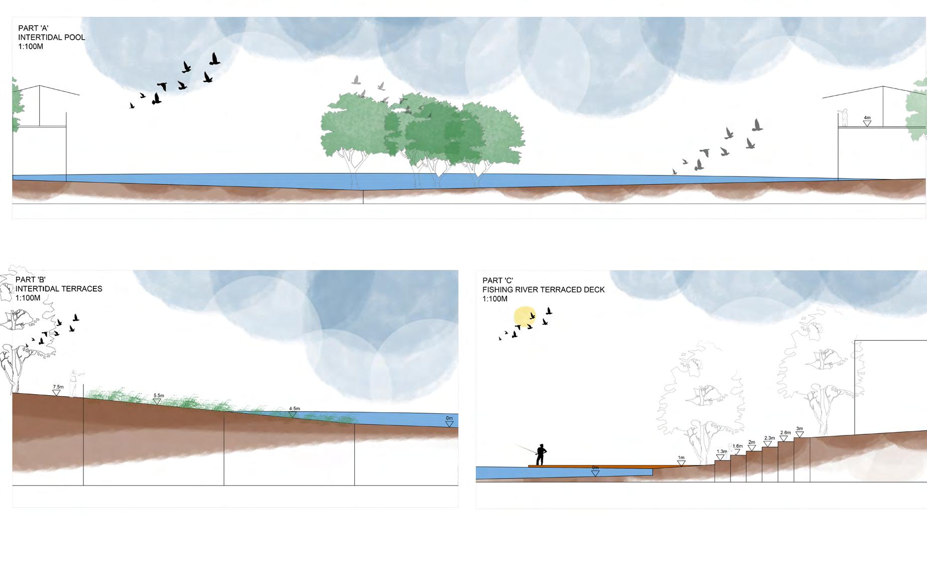 Part ‘B’ shows a section of a proposed intertidal terraced estuary edge shared by the nearby Mahim Nature Reserve and the river. For fish breeding and the terraces to function as a good marine biodiversity host the terraces are built at a gradient of 1:10 and lies in the