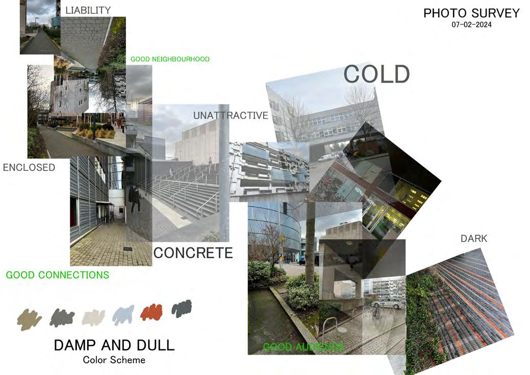After conducting the photo survey, I had got the initial idea of my concept. I definitely wanted to change the existing cold and grey toned area to a bustling, chirpy and contrastingly hued area.