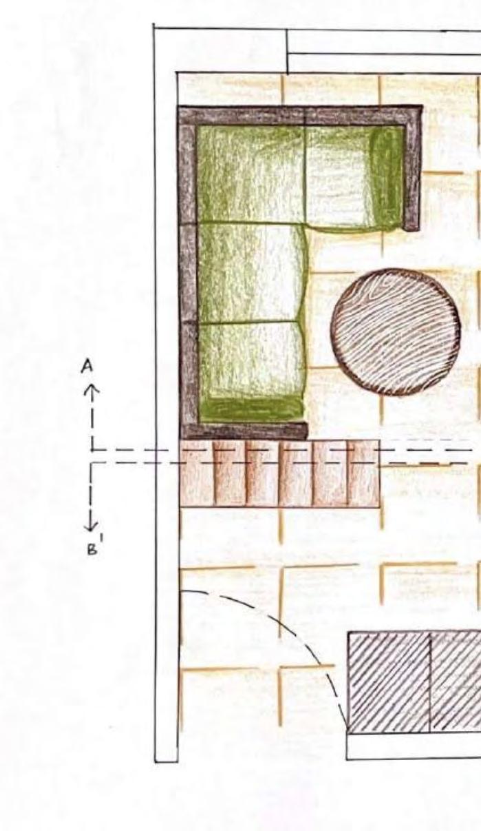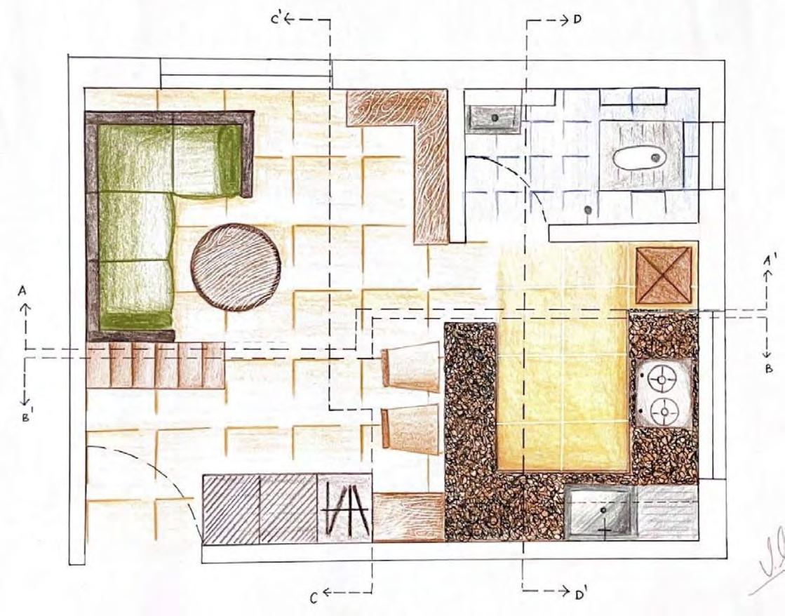 The design brief was to design for a studio apartment. On the right hand side, the kitchen plan and sections show a design for a parallel counter-top kitchen and some of my furniture designs in sections and also rendered by hand in 3D.