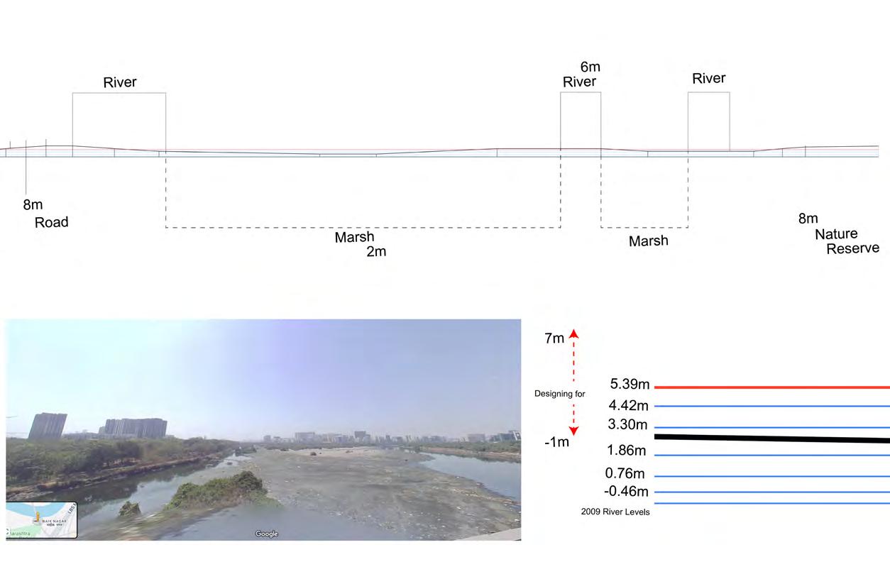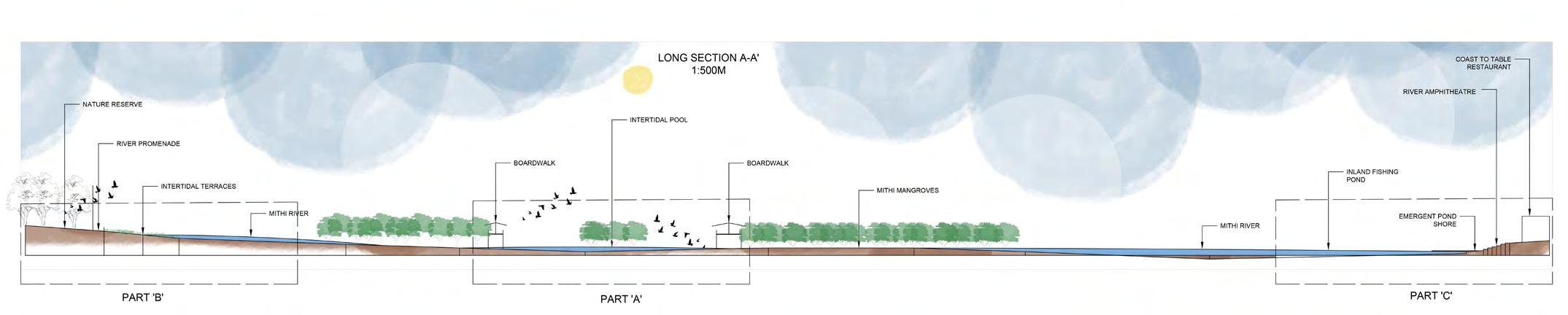 This long section shows the elevation change between the northern and southern coast of the river. The section runs from the existing nature reserve in the south right to the proposed mithi coastal park to the north. The section evidences the level change of the proposed design features like intertidal terraces, boardwalks, intertidal pools to the corresponding river levels.