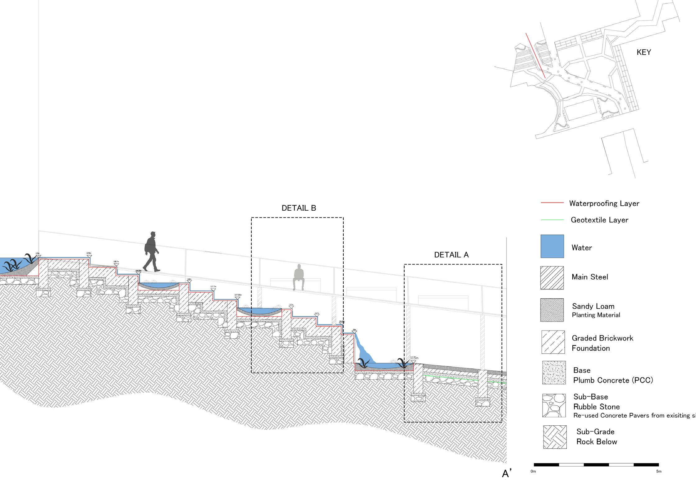 Part ‘A’ shows a section of the central river amphitheatre. The amphitheatre will remain functional every season leaving the monsoon season. In times of heavy rainfall, the terraces can get submerged with each rising tide of the Mithi river. The amphitheatre will host various concerts, music shows, events which were once held at the MMRDA fairground.