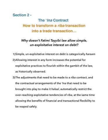 Section 2 The ‘Ina Contract How to transform a riba transaction into a trade transaction… Why doesn’t Fatimi Tayyibi law allow simple, un-exploitative interest on debt? 1)Simple, un-exploitative interest on debt is categorically haraam 2)Allowing interest in any form increases the potential for exploitative practices to flourish within the gambit of the law, as historically observed. 3)The adjustments that need to be made to a riba contract, and the contractual arrangements of the ‘Ina that need to be brought into play to make it halaal, automatically restrict the over-reaching exploitative tendencies of riba, at the same time allowing the benefits of financial and transactional flexibility to be reaped safely.