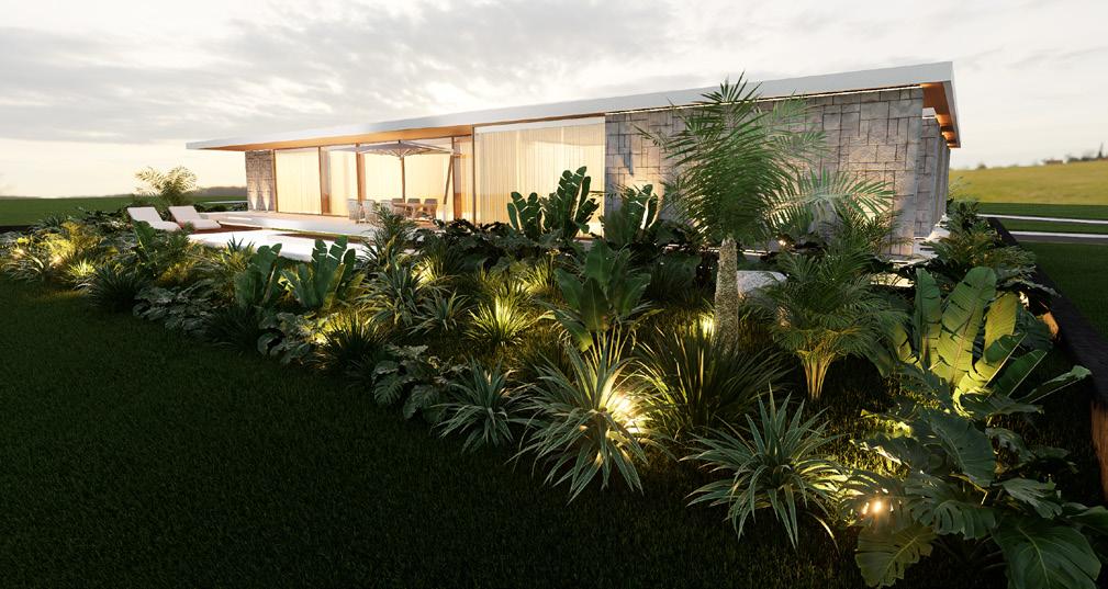 El entorno verde, con vegetación tropical abundante, resalta el diseño, mientras que las luminarias estratégicas aportan un ambiente elegante de noche. Esta evolución maximiza la funcionalidad de los espacios, manteniendo una estética armoniosa con la naturaleza circundante y optimizando los metros cuadrados de construcción.