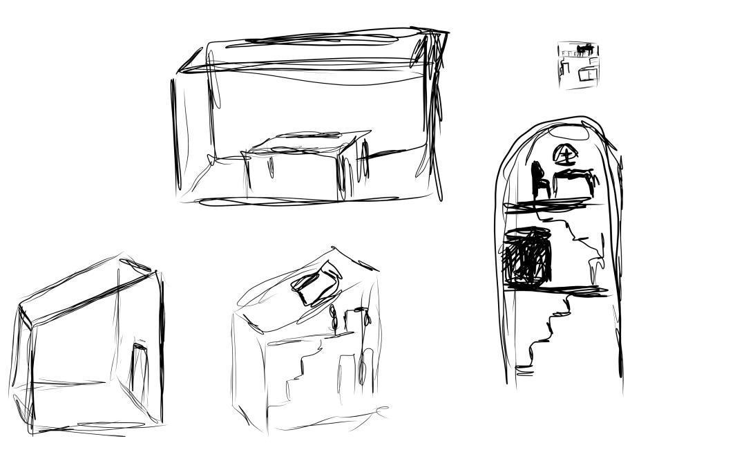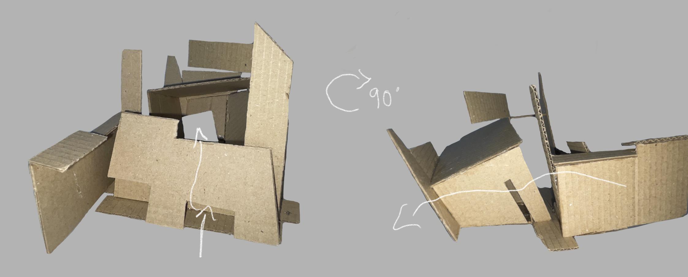 My first iteration explores the constrictions and contrasts of space, where the front view is compact with minimal free flowing space, as portrayed through the arrows on the previous page, a 90 degree turn will show a much more open space.