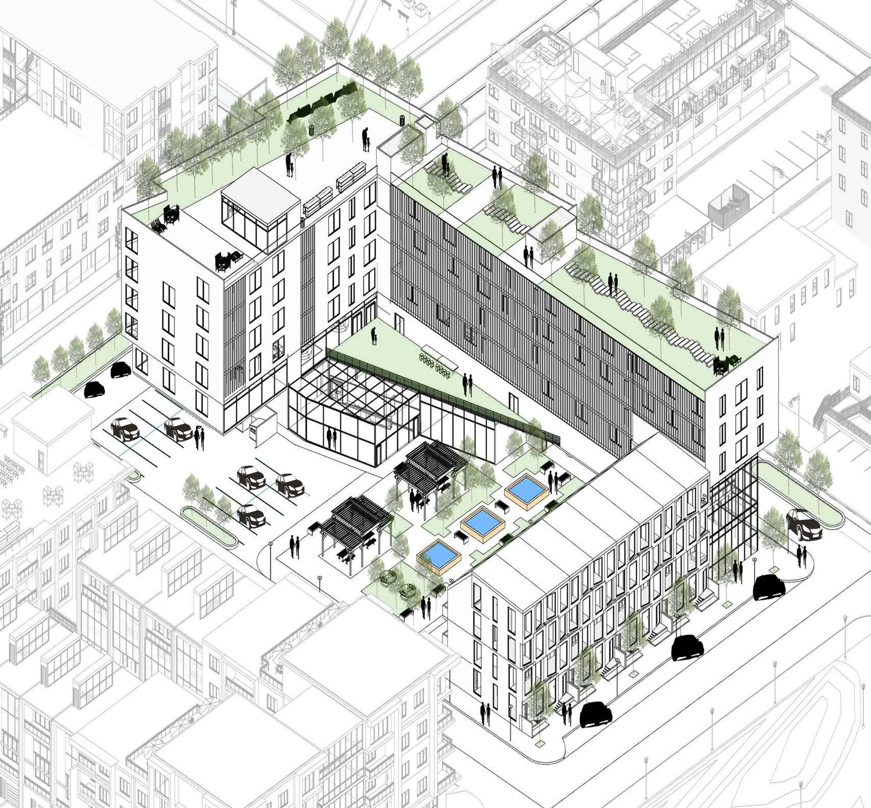 Mixed-use development for the growing Goucher Neighborhood. Created a design for the intended structure utilizing only one predominant material, such as wood, metal, brick, or stone, while incorporating glass and concrete for openings and foundations.