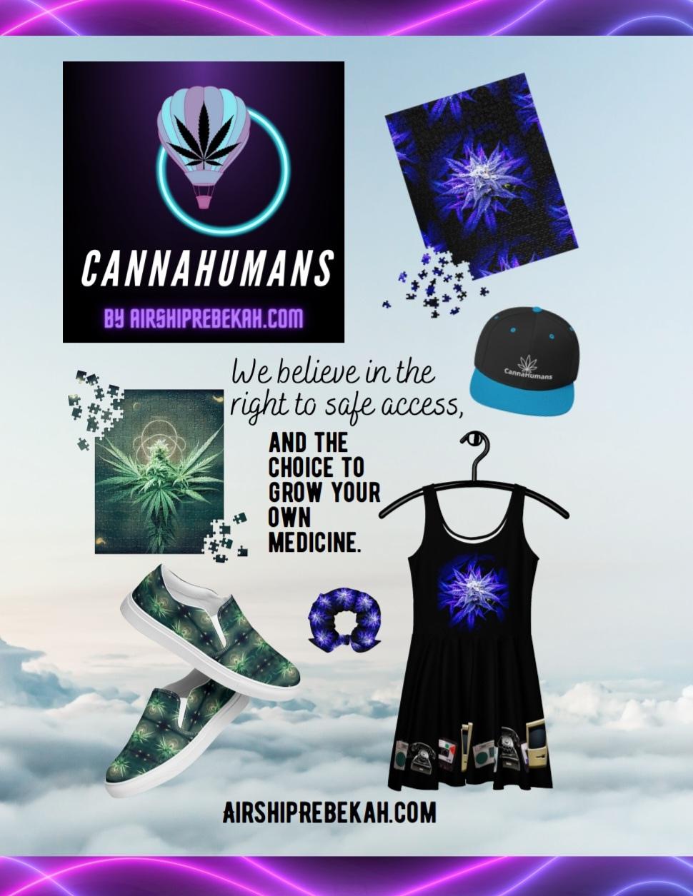 RJ: My art and clothing designs are available on AirshipRebekah com It’s currently just me running the show. All of the Airship items are made to order to help reduce overproduction, and for every CannaHumans item you purchase, we donate $10 to the Sweetleaf Collective!