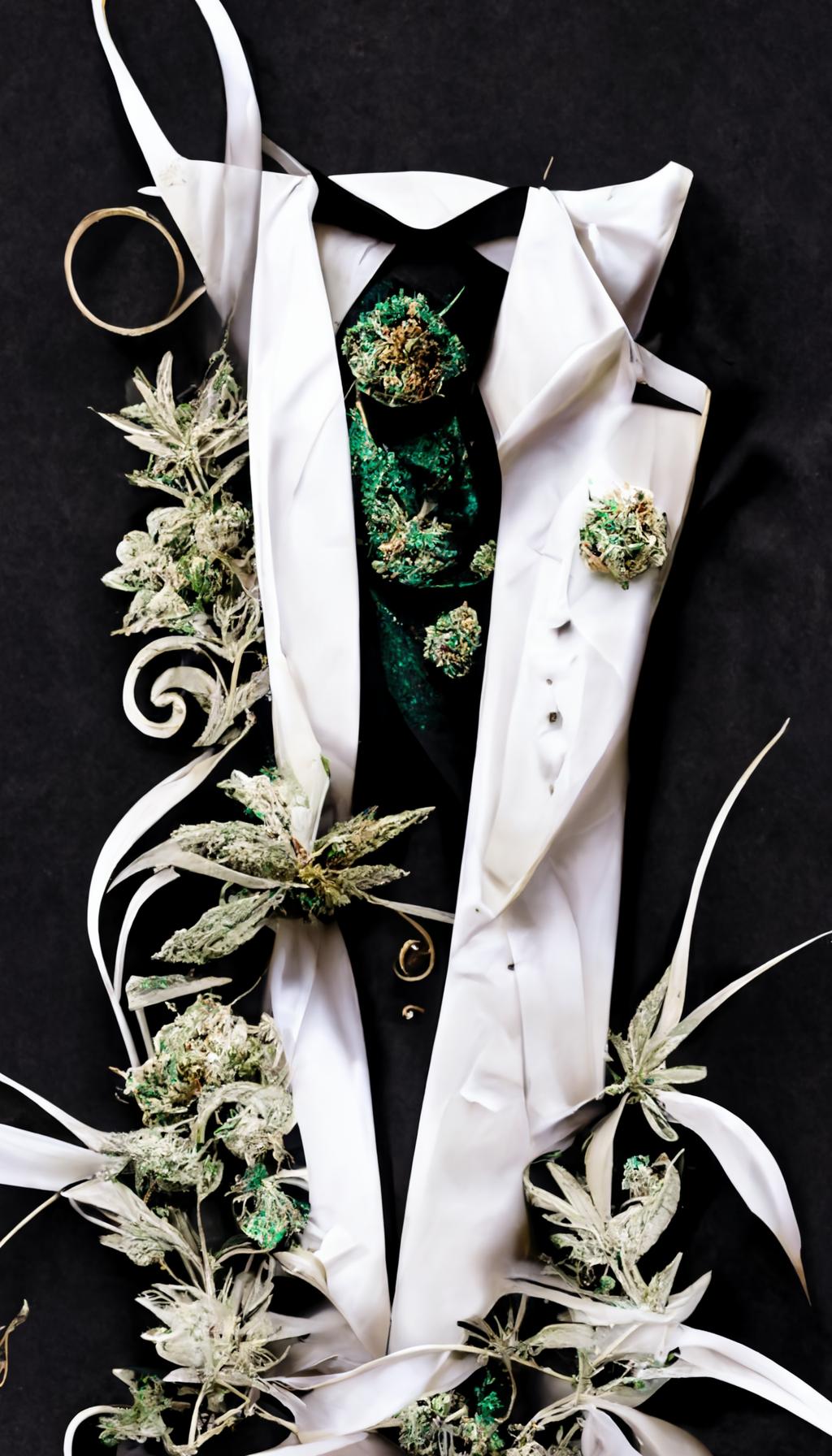 Because cannabis weddings are rightfully growing more and more popular every season, Dustin Hoxworth (Founder, Creative Director, and Editor At Large for Fat Nugs Magazine) and I felt it was only appropriate to highlight such a positive cultural movement within the pages of FNM. One of our beloved writers, Jessica Reilly Chevalier, shared a photo of herself smoking a joint in her wedding dress on LinkedIn, and we knew instantly that her wedding story needed to be featured in this special edition You can scope it yourself on page eight, right after doing your best to keep your jaw from perpetually dropping when viewing the AI creations of Rebekah Jenks. She shares her story of love, art, and cannabis on page four.