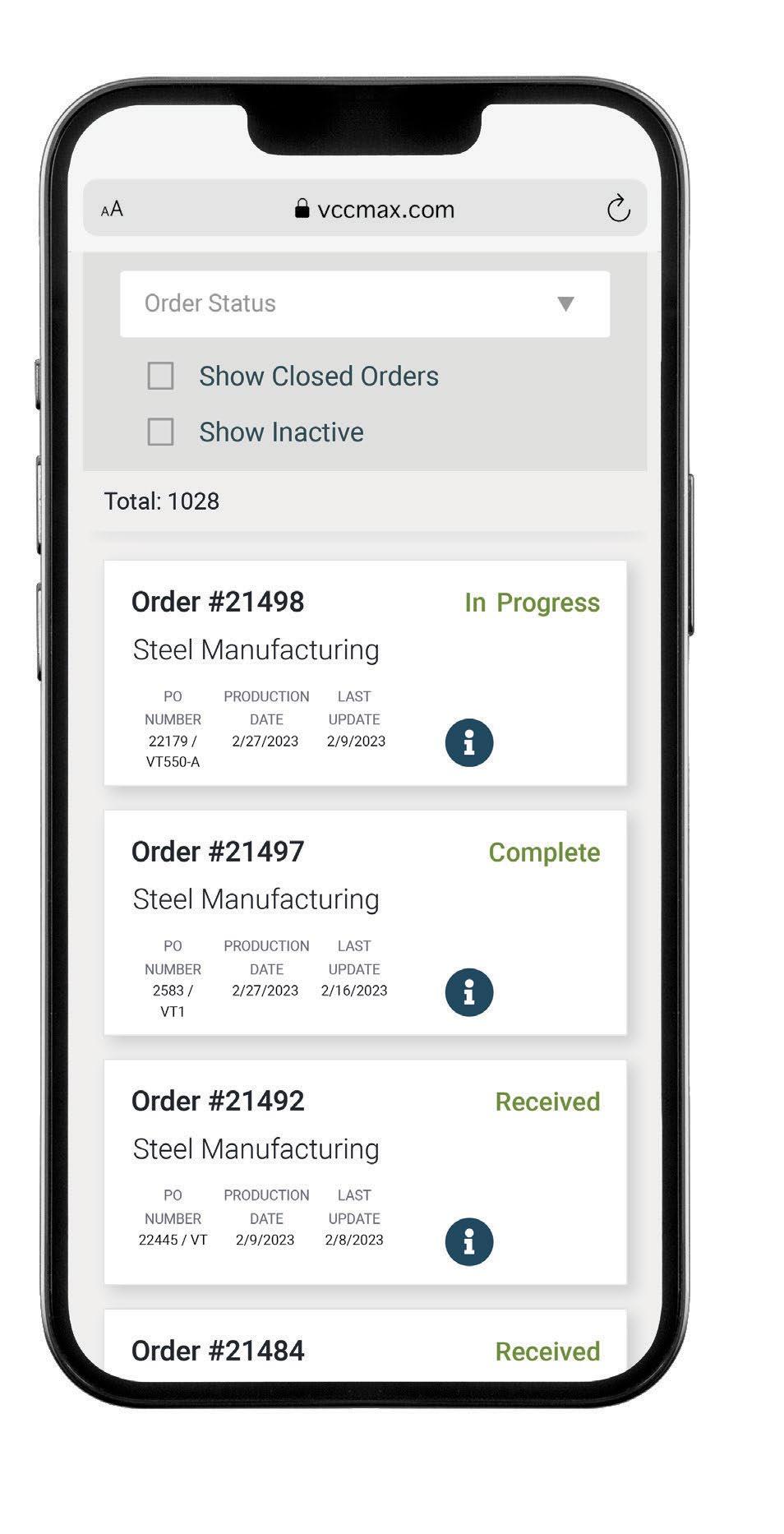 Receive automated alerts at every step and access order documentation from any connected device, with VCC Max.