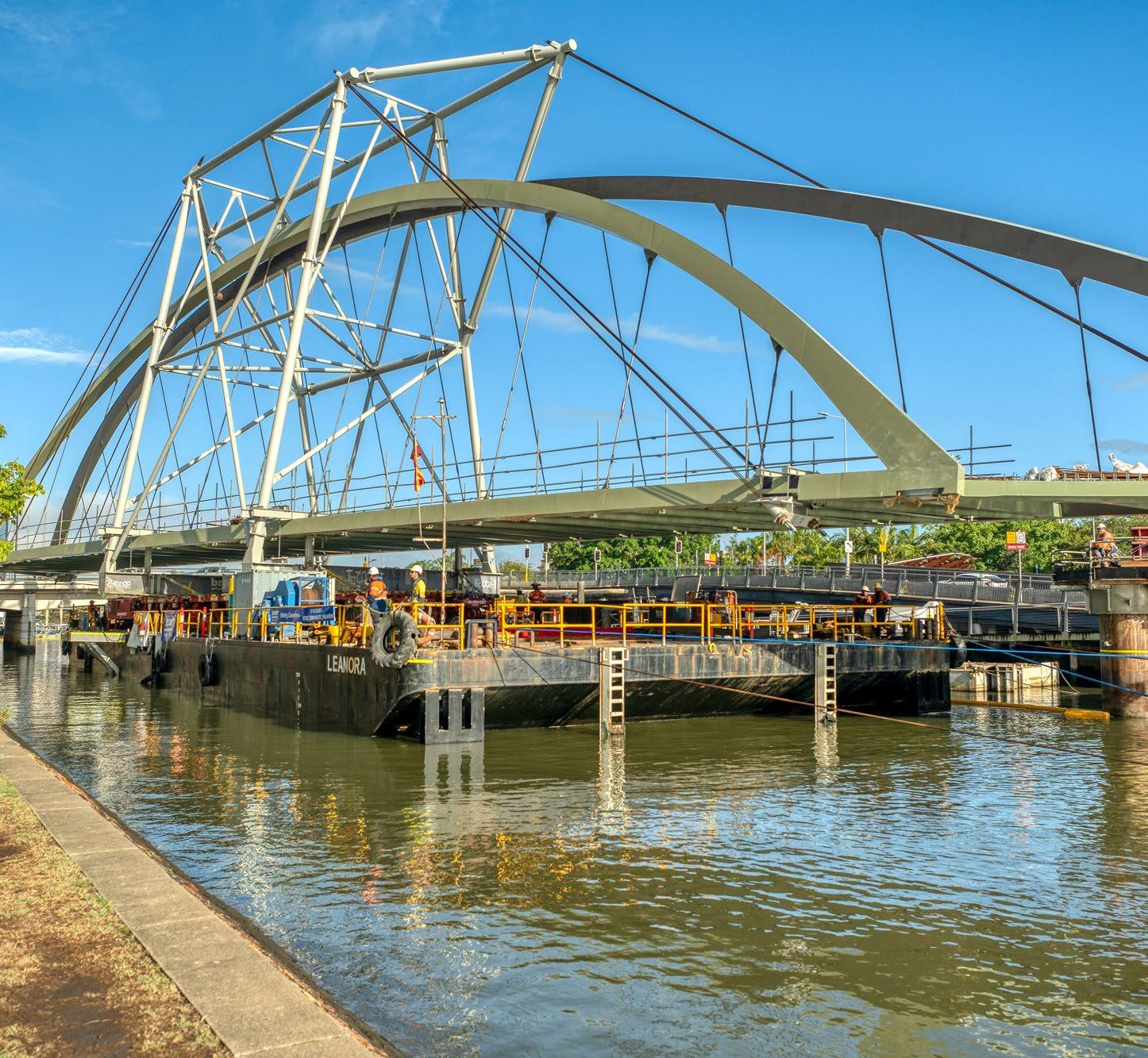 Over 35,000 labour hours were required before the bridge was assembled into one unit at the port-side lay down area, and then lifted into place using a barge along the Brisbane River. The steel portion of the bridge measured over 90m wide, 15m high and a weight of 290 tonnes.