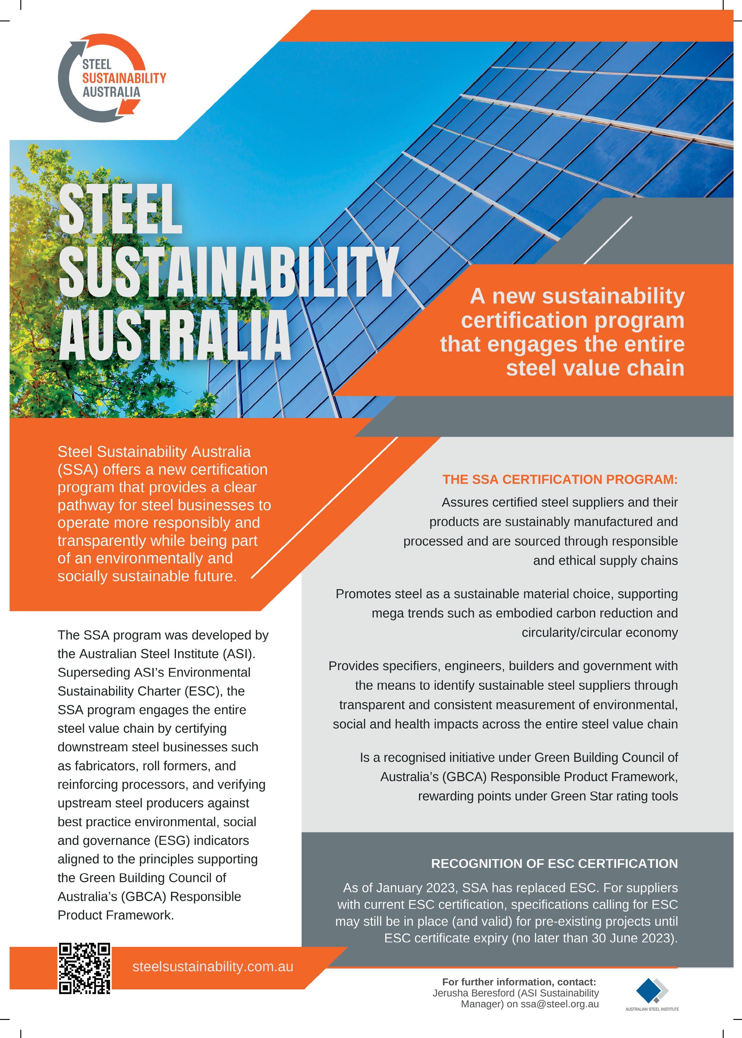 Finally, Steel Sustainability Australia (SSA)—ASI's new certification program that provides a clear pathway for steel businesses to operate more responsibly and transparently while being part of an environmentally and socially sustainable future—has been working with several steel distributors, manufacturers, roll formers and fabricators on certification.