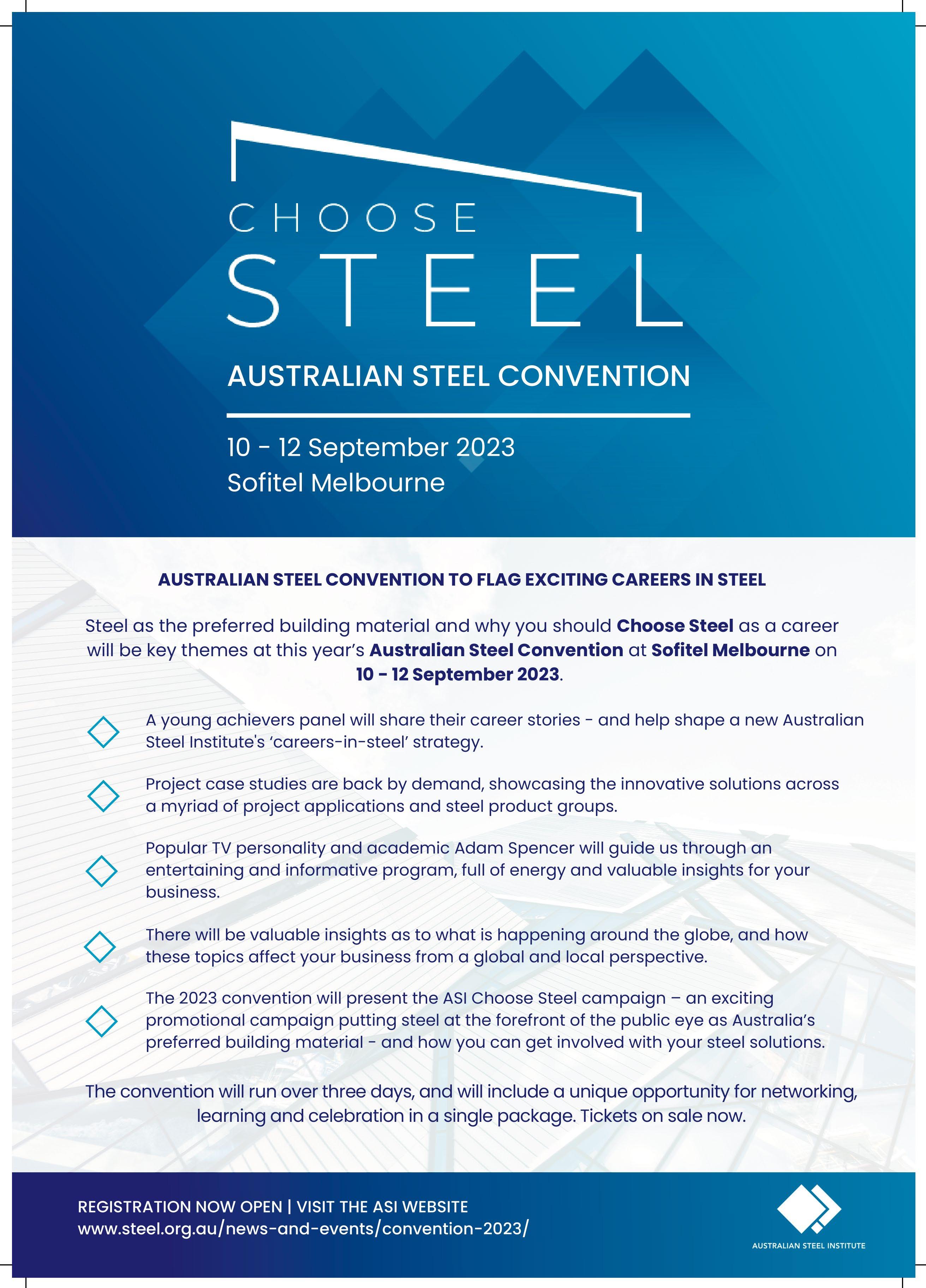 Success could see the ASI roll out the campaign to other states – and a range of other steel products targeted using the same Choose Steel formula. Choose Steel will also be theme for the Australian Steel Convention in Melbourne from September 10 to 12.