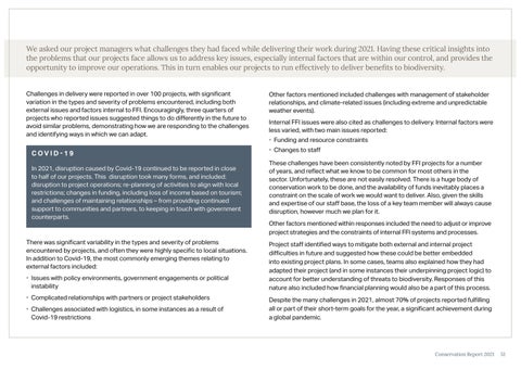 Covid -19 In 2021, disruption caused by Covid-19 continued to be reported in close to half of our projects. This disruption took many forms, and included: disruption to project operations; re-planning of activities to align with local restrictions; changes in funding, including loss of income based on tourism; and challenges of maintaining relationships – from providing continued support to communities and partners, to keeping in touch with government counterparts. There was significant variability in the types and severity of problems encountered by projects, and often they were highly specific to local situations. In addition to Covid-19, the most commonly emerging themes relating to external factors included: • Issues with policy environments, government engagements or political instability • Complicated relationships with partners or project stakeholders