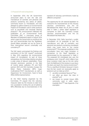 5.3 Proposed UK national legislation In September 2016, the UK Government announced plans to ban the sale and manufacture of cosmetic and personal care products containing tiny pieces of plastic, commonly known as ‘microbeads’, and also pledged to gather evidence on environmental impacts of microbeads used in other products such as household and industrial cleaning products13. This announcement followed the publication of an Environmental Audit Committee (EAC, a cross-party group of Members of Parliament) report in August 2016 which urged the Government to introduce the ban and recommended that the “legislation should follow principles set out by Fauna & Flora International around universality and consistency”68.