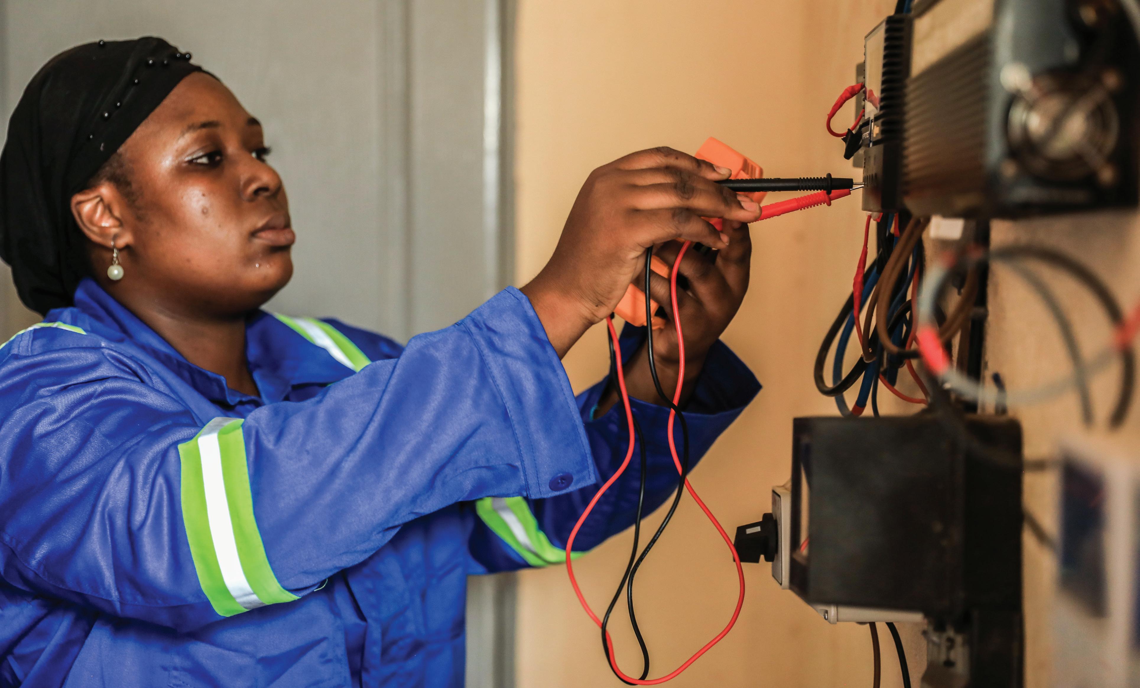 Des bénéficiaires du projet de création d'entreprises durables pour les jeunes inspectent une installation d’energie solaire en novembre 2021. Le projet est financé par Norad.