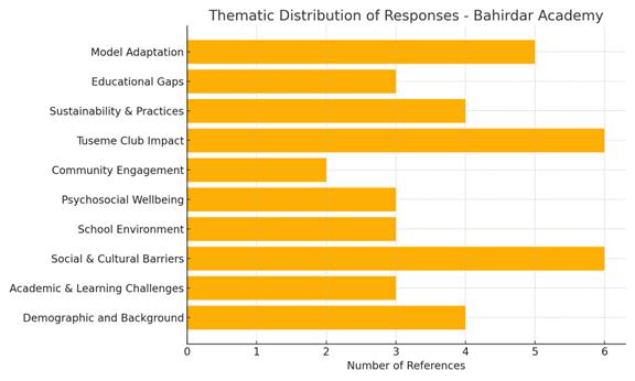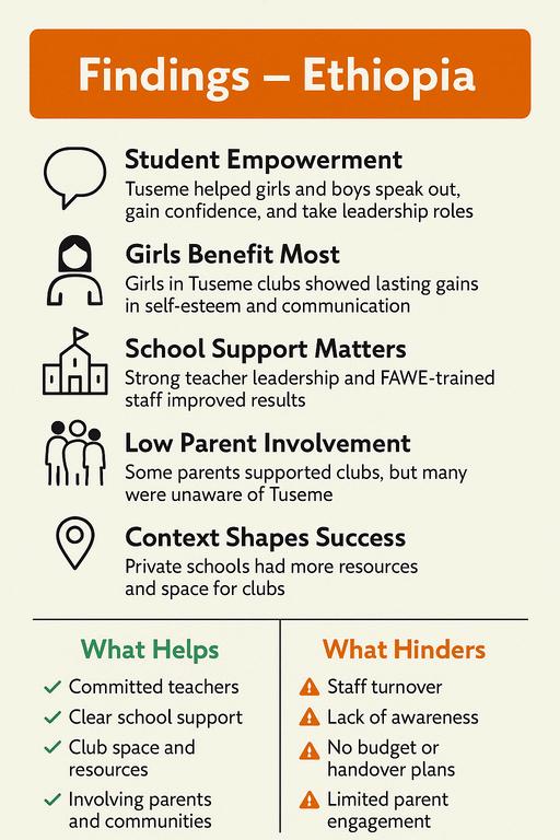 Enabling factors for the successful adaptation of the Tuseme model in Ethiopia include strong institutional support, particularly from schools like Bahir Dar Academy, which offer a K-12 structure that facilitates phased and integrated implementation The flexibility of the Tuseme model itself, with its focus on open expression and leadership, can be tailored to different educational levels. Additionally, the growing interest in gender equality and empowerment within Ethiopian educational institutions supports the model's uptake. The linguistic diversity of the country also presents an opportunity to adapt the model's materials in Amharic and Oromo, ensuring accessibility and relevance to a broader audience Finally, the presence of active community and parental engagement in certain regions provides a strong foundation for sustaining the model’s impact.