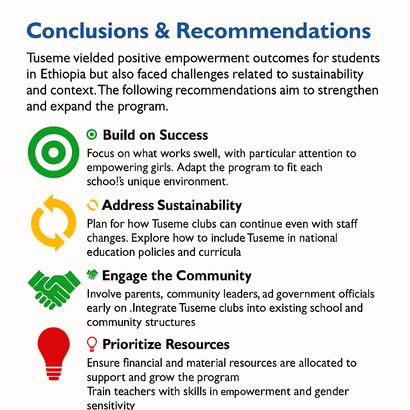 The findings from Ethiopian schools highlight the challenges and opportunities for adapting the Tuseme model. Factors such as urban versus regional locations, private versus government schools, and language diversity (particularly Amharic and Oromo) influence the implementation process The shift system at large government schools like Tabor Secondary School and the unique K-12 structure at Bahir Dar Academy require tailored scheduling and flexible activity formats Key implications for adaptation include developing linguistically appropriate materials in Amharic and Oromo, accommodating school structures, addressing resource disparities between school types, and leveraging the K-12 system to foster long-term impact on student confidence and expression.