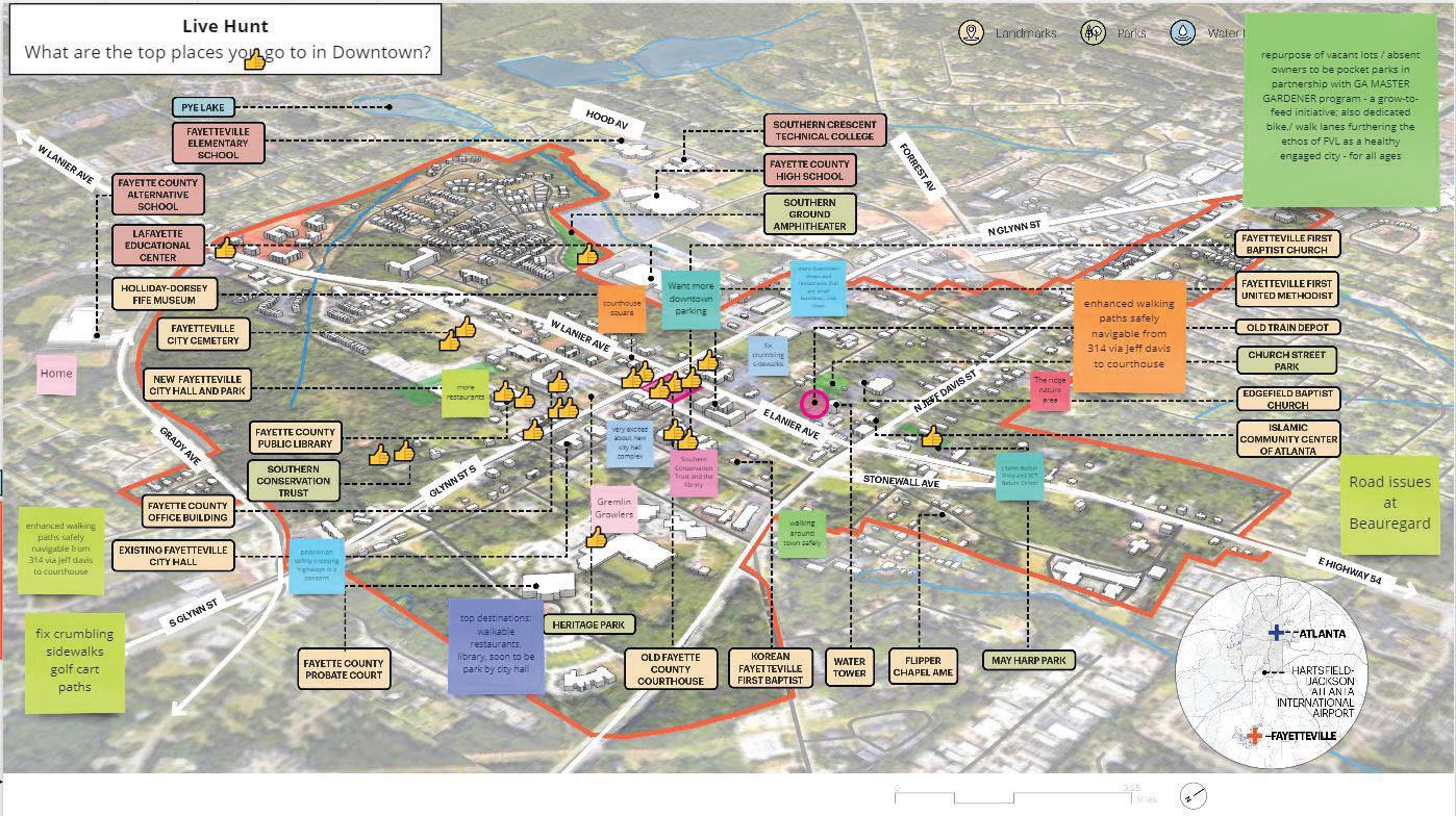 In 2002, the City of Fayetteville conducted an LCI Study, and as part of this study the community was engaged as to what issues and opportunities they saw the city facing. During this engagement, the community identified certain issues such as a need for a useful open space in Downtown Fayetteville, and the desire to provide a more pedestrian friendly environment downtown. Some of the opportunities the community identified include reduced traffic congestion, and increased facilities for pedestrians and bicyclists, as well as added public open spaces and green spaces able to host cultural events. At the time of this study, only 3% of the total city acreage was dedicated to parks and open spaces. Some of these areas include a park downtown, a pocket park north of Lanier Avenue on Church St., a cemetery, and an amphitheater constructed in conjunction with The Villages development. This discussion led to the identification of certain future projects that could help add more park space and open space to Downtown Fayetteville including a new Fayetteville Village Green to be surrounded by mixed use development and pedestrian amenities which can be used to host community events, the development of a central open space on Church St. as part of a green way in the Main Street Residential District, preservation of existing green space along Beauregard Blvd., redevelopment of the city park by the county office building, develop a greenway system connecting major city landmarks and residential clusters, and construct landscaped entry gateways at major intersections and nodes into the downtown area.