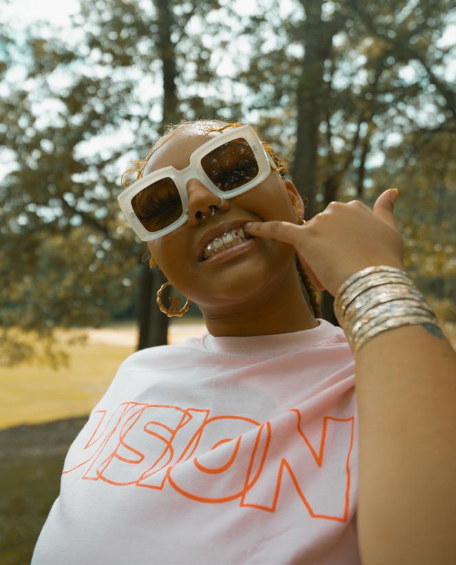 Kornball, a Fayetteville native, founded KTSD - Kids That Still Dream. His rack held some sick designs. Kornball stated, “My clothes mean a lot to me. I am very passionate about it. I started young, and seeing it come to fruition feels good. It’s tangible now; it is no longer a dream.” My favorite piece from his rack was his off-the-shoulder varsity bomber-style jacket. I could see myself in it! With locs and thoughtful thoughts, Kornball said,