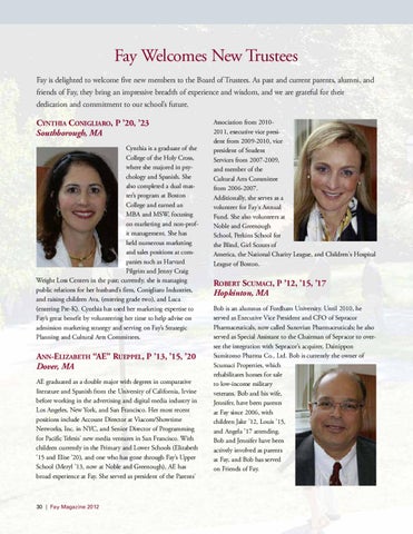 ROBERT SCUMACI, P ’12, ’15, ’17 Hopkinton, MA Bob is an alumnus of Fordham University. Until 2010, he served as Executive Vice President and CFO of Sepracor Pharmaceuticals, now called Sunovian Pharmaceuticals; he also served as Special Assistant to the Chairman of Sepracor to oversee the integration with Sepracor’s acquirer, Dainippon Sumitomo Pharma Co., Ltd. Bob is currently the owner of Scumaci Properties, which rehabilitates homes for sale to low-income military veterans. Bob and his wife, Jennifer, have been parents at Fay since 2006, with children Jake ’12, Louis ’15, and Angela ’17 attending. Bob and Jennifer have been actively involved as parents at Fay, and Bob has served on Friends of Fay.
