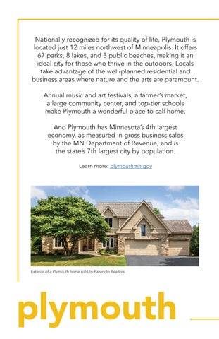 Located along the southern border of Hennepin County, Eden Prairie home to over 64,000 people and more than 2,800 businesses. This city provides an ideal environment for living well with its attractive residential neighborhoods and nearly 10,000 acres of land designated for parks and open spaces, miles of scenic views and a multitude of breathtaking lakes and beaches. Other perks include awardwinning restaurants, top-ranked schools and a myriad entertainment and lifestyle options.