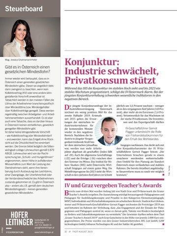 ie jüngste Konjunkturumfrage der Industriellenvereinigung Steiermark zeichnet ein wenig positives Bild für das zweite Halbjahr 2019. Erstmals seit 2015 gehen die Erwartungen der steirischen Industrieunternehmen für die kommenden Monate wieder in den negativen Bereich. Nachdem die Industrie in jüngster Vergangenheit treibende Kraft hinter dem steirischen Jobaufbau war, werden nun mehr Arbeitsplätze abgebaut als geschaffen (Index fällt auf -20). Auch die allgemeine Geschäftslage (-22) und die Erträge (-26) rutschen über den Sommer ins Minus. Das Institut für Höhere Studien (IHS) sieht Österreichs Wirtschaft hingegen auf einem guten Weg. Die Mittelfristprognose bis 2023 sieht die Wirtschaft in den nächsten fünf Jahren im Schnitt