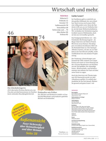 Redaktionsanschrift Schmiedgasse 38/II, A-8010 Graz T. 0316/671929*0. F.*33 office@wmedia.at fazitmagazin.at facebook.com/fazitmagazin