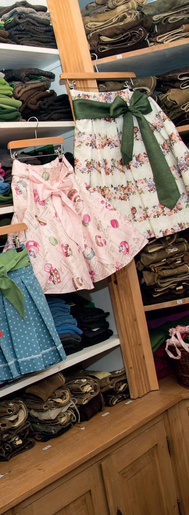 Nachhaltigkeit und Qualität Letztlich ist es aber doch das märchenhafte Warenangebot, das die Kundschaft aus nah und fern anzieht. Beim Gerstner lassen sich Kinder von 0 bis 16 Jahren von der Unterwäsche bis zum Mantel vollständig einkleiden und das in einer Qualität, die ih resgleichen sucht. Gerade Naturmaterialien wie Baumwolle und Leinen ermöglichen zum Beispiel bei einem Dirndl eine weitere Nutzung für die kleinen Schwestern und entsprechen in puncto Nachhaltigkeit dem Trend der Zeit. Das ist eine der weiteren Stär ken gegenüber der Billigkonkurrenz. Ein weiterer Wettbewerbs vorteil ist die eigene Schneiderei, in der viele Modelle entworfen und zugeschnitten werden, um dann im Inland in Heimarbeit zu sammengenäht zu werden. Außerdem wird die Kleidung in allen Größen, von XS bis XXL, angeboten, schließlich ist das Einheitsgrö ßenkind noch nicht erfunden. Auch Touristen zieht dieses Kinder modengeschäft wie ein Magnet an – denn wissen Sie, was es hier noch gibt? Stutzen. Richtige Kinderstutzen! n