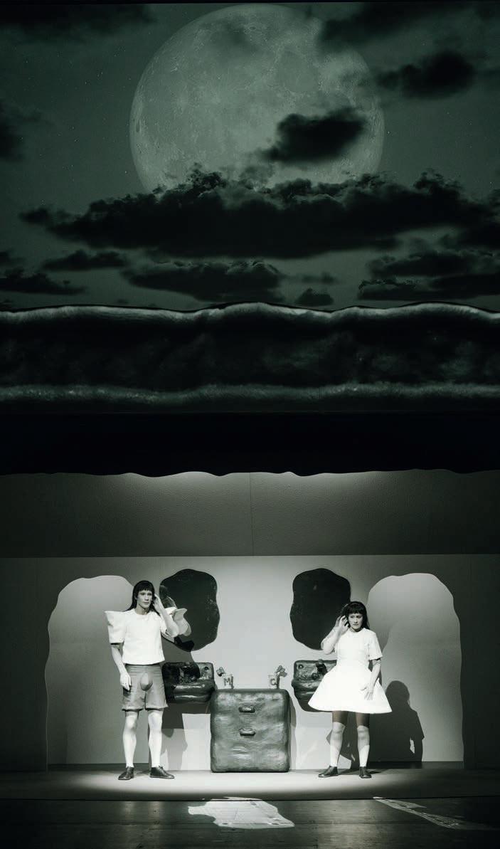 Schon durch die vom genialen Tüftler Enik entworfene Soundstruktur sind wir akustisch beglückt angekommen. Zudem überzeugt die Sprachstruktur. Es gibt nur wenig gesprochenes Wort in der Inszenierung. Die Reduktion ist jedoch so fein und subtil, dass das umwerfende Ensemble und die nachgerade gesamtkunstwerkliche Inszenierung das Publikum über eineinhalb Stunden an den Sessel schraubt. So eine Verinnerlichung der Spielfiguren mit dem Bühnenbild erlebt man selten. Es gemahnt zuweilen an einen Trickfilm aus vordigitaler Zeit, an Puppenbühnen, an Traumwandlung.
