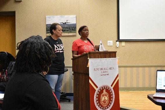 To say that chapter members were ecstatic, would be an understatement. Fort Bragg had barely finished showering congratulations on chapter member Glenell Smoot, who was named Delta Dear of the Year for the Region, when chapter president Tywanna Frazier and vice president, Tara Lee- Brown were running to the podium as it was announced that Fort Bragg Area Alumnae was named SouthAtlantic Region’s 2022 Alumnae Chapter of the Year ! The chapter started the evening with high hopes as competitive packages for several categories were submitted; none of which produced the desired outcome. With expectations wanning, the chapter’s name rang out over the sound system, and Sorors erupted into cheers and screams! This is Fort Bragg’s second Chapter of the Year recognition in 4 years!