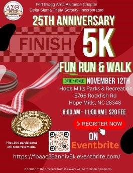 FBAAC celebrated over 25 years of service to the Fort Bragg, Hope Mills, Spring Lake, and Raeford communities on November 12th, 2022. It was the first time that chapter members were able to gather in-person since the pandemic to commemorate the milestone, which was reached in 2021! The ADHOC committee partnered with PHYSICAL AND MENTAL HEALTH, as well as ARTS AND LETTERS to provide chapter members and guests with a weekend of wellness/community service, cultural and social events, which included a 5K W alk/Run (open to the community), that raised over $800.00 and a Red-Carpet event featuring the movie Wakanda Forever, at Millstone 14 in Hope Mills, NC. The SOLD-OUT Arts and Letters event was so popular, that a second theater was requested for a total seating capacity of approximately 400 guests! Charter members, Fort Bragg “Made” line sisters, Past Presidents and Chapter Members were able to reconnect and share memories at a Friday night, pre-celebration meet and greet. Four of the five Fort Bragg lines were represented during the weekend. Sorors were presented with a commemorative coin (a military tradition) to mark the occasion. The chapter also established the “FBAAC Legacy Scholarship at the Delta Research and Educational Foundation, raising $2,500 in honor of this momentous occasion.