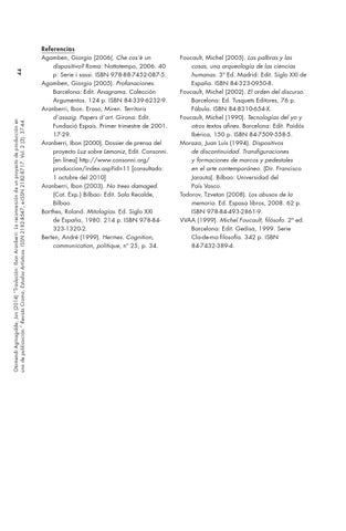 Referencias Agamben, Giorgio (2006(. Che cos’è un dispositivo? Roma: Nottotempo, 2006. 40 p. Serie i sassi. ISBN 978-88-7452-087-5. Agamben, Giorgio (2005). Profanaciones. Barcelona: Edit. Anagrama. Colección Argumentos. 124 p. ISBN 84-339-6232-9. Aranberri, Ibon. Eraso, Miren. Territoris d´assaig. Papers d´art. Girona: Edit. Fundació Espais. Primer trimestre de 2001. 17-29. Aranberri, Ibon (2000). Dossier de prensa del proyecto Luz sobre Lemoniz, Edit. Consonni. [en línea] http://www.consonni.org/ produccion/index.asp?id=11 [consultado: 1 octubre del 2010] Aranberri, Ibon (2003). No trees damaged. (Cat. Exp.) Bilbao: Edit. Sala Recalde, Bilbao. Barthes, Roland. Mitologías. Ed. Siglo XXI de España, 1980. 214 p. ISBN 978-84323-1320-2. Berten, André (1999). Hermes. Cognition, communication, politique, nº 25, p. 34.