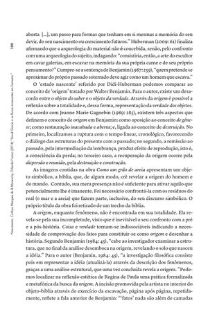 aberta [...], um passo para formas que tenham em si mesmas a memória do seu devir, do seu nascimento ou crescimento futuros.” Huberman (2009: 61) finaliza afirmando que a arqueologia do material não é concebida, senão, pelo confronto com uma arqueologia do sujeito, indagando: “consistiria, então, a arte do escultor em cavar galerias, em escavar na memória da sua própria carne e de seu próprio pensamento?” Cumpre-se a sentença de Benjamin (1987: 239), “quem pretende se aproximar do próprio passado soterrado deve agir como um homem que escava.” O ‘estado nascente’ referido por Didi-Huberman podemos comparar ao conceito de ‘origem’ tratado por Walter Benjamin. Para o autor, existe um desacordo entre o objeto do saber e o objeto da verdade. Através da origem é possível a reflexão sobre a totalidade e, dessa forma, representação da verdade dos objetos. De acordo com Jeanne Marie Gagnebin (1989: 285), existem três aspectos que definem o conceito de origem em Benjamin: como oposição ao conceito de gênese; como restauração inacabada e aberta; e, ligada ao conceito de destruição. No primeiro, localizamos a ruptura com o tempo linear, cronológico, favorecendo o diálogo das estruturas do presente com o passado; no segundo, a remissão ao passado, pela intermediação da lembrança, produz efeito de reprodução, isto é, a consciência da perda; no terceiro caso, a recuperação da origem ocorre pela dispersão e reunião, pela destruição e construção. As imagens contidas na obra Como um grão de areia apresentam um objeto simbólico, a bíblia, que, de algum modo, crê revelar a origem do homem e do mundo. Contudo, sua mera presença não é suficiente para ativar aquilo que potencialmente lhe é imanente. Foi necessário confrontá-la com os resíduos do real (o mar e a areia) que fazem parte, inclusive, do seu discurso simbólico. O próprio título da obra foi retirado de um trecho da bíblia. A origem, enquanto fenômeno, não é encontrada em sua totalidade. Ela revela-se pela sua incompletude, visto que é inevitável o seu confronto com a pré e a pós-história. Coisa e verdade tornam-se indissociáveis indicando a necessidade de comprovação dos fatos para constituir-se como origem e desenhar a história. Segundo Benjamin (1984: 45), “cabe ao investigador examinar a estrutura, que no final da análise desemboca na origem, revelando o solo que nasceu a idéia.” Para o autor (Benjamin, 1984: 45), “a investigação filosófica consiste pois em representar a idéia (atualizá-la) através da descrição dos fenômenos, graças a uma análise estrutural, que uma vez concluída revela a origem. ”Podemos localizar na reflexão estética de Regina de Paula uma prática formalizada e metafórica da busca da origem. A incisão promovida pela artista no interior do objeto-bíblia através do exercício da escavação, página após página, repetidamente, reflete a fala anterior de Benjamin: “‘fatos’ nada são além de camadas
