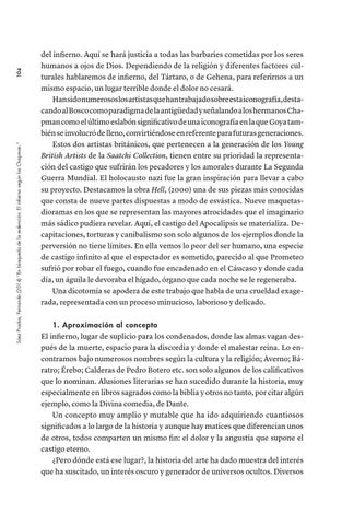 del infierno. Aquí se hará justicia a todas las barbaries cometidas por los seres humanos a ojos de Dios. Dependiendo de la religión y diferentes factores culturales hablaremos de infierno, del Tártaro, o de Gehena, para referirnos a un mismo espacio, un lugar terrible donde el dolor no cesará. Han sido numerosos los artistas que han trabajado sobre esta iconografía, destacando al Bosco como paradigma de la antigüedad y señalando a los hermanos Chapman como el último eslabón significativo de una iconografía en la que Goya también se involucró de lleno, convirtiéndose en referente para futuras generaciones. Estos dos artistas británicos, que pertenecen a la generación de los Young British Artists de la Saatchi Collection, tienen entre su prioridad la representación del castigo que sufrirán los pecadores y los amorales durante La Segunda Guerra Mundial. El holocausto nazi fue la gran inspiración para llevar a cabo su proyecto. Destacamos la obra Hell, (2000) una de sus piezas más conocidas que consta de nueve partes dispuestas a modo de esvástica. Nueve maquetasdioramas en los que se representan las mayores atrocidades que el imaginario más sádico pudiera revelar. Aquí, el castigo del Apocalipsis se materializa. Decapitaciones, torturas y canibalismo son solo algunos de los ejemplos donde la perversión no tiene límites. En ella vemos lo peor del ser humano, una especie de castigo infinito al que el espectador es sometido, parecido al que Prometeo sufrió por robar el fuego, cuando fue encadenado en el Cáucaso y donde cada día, un águila le devoraba el hígado, órgano que cada noche se le regeneraba. Una dicotomía se apodera de este trabajo que habla de una crueldad exagerada, representada con un proceso minucioso, laborioso y delicado. 1. Aproximación al concepto El infierno, lugar de suplicio para los condenados, donde las almas vagan después de la muerte, espacio para la discordia y donde el malestar reina. Lo encontramos bajo numerosos nombres según la cultura y la religión; Averno; Báratro; Érebo; Calderas de Pedro Botero etc. son solo algunos de los calificativos que lo nominan. Alusiones literarias se han sucedido durante la historia, muy especialmente en libros sagrados como la biblia y otros no tanto, por citar algún ejemplo, como la Divina comedia, de Dante. Un concepto muy amplio y mutable que ha ido adquiriendo cuantiosos significados a lo largo de la historia y aunque hay matices que diferencian unos de otros, todos comparten un mismo fin: el dolor y la angustia que supone el castigo eterno. ¿Pero dónde está ese lugar?, la historia del arte ha dado muestra del interés que ha suscitado, un interés oscuro y generador de universos ocultos. Diversos