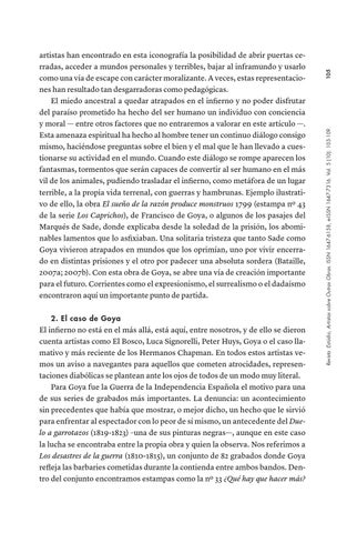 artistas han encontrado en esta iconografía la posibilidad de abrir puertas cerradas, acceder a mundos personales y terribles, bajar al inframundo y usarlo como una vía de escape con carácter moralizante. A veces, estas representaciones han resultado tan desgarradoras como pedagógicas. El miedo ancestral a quedar atrapados en el infierno y no poder disfrutar del paraíso prometido ha hecho del ser humano un individuo con conciencia y moral — entre otros factores que no entraremos a valorar en este artículo —. Esta amenaza espiritual ha hecho al hombre tener un continuo diálogo consigo mismo, haciéndose preguntas sobre el bien y el mal que le han llevado a cuestionarse su actividad en el mundo. Cuando este diálogo se rompe aparecen los fantasmas, tormentos que serán capaces de convertir al ser humano en el más vil de los animales, pudiendo trasladar el infierno, como metáfora de un lugar terrible, a la propia vida terrenal, con guerras y hambrunas. Ejemplo ilustrativo de ello, la obra El sueño de la razón produce monstruos 1799 (estampa nº 43 de la serie Los Caprichos), de Francisco de Goya, o algunos de los pasajes del Marqués de Sade, donde explicaba desde la soledad de la prisión, los abominables lamentos que lo asfixiaban. Una solitaria tristeza que tanto Sade como Goya vivieron atrapados en mundos que los oprimían, uno por vivir encerrado en distintas prisiones y el otro por padecer una absoluta sordera (Bataille, 2007a; 2007b). Con esta obra de Goya, se abre una vía de creación importante para el futuro. Corrientes como el expresionismo, el surrealismo o el dadaísmo encontraron aquí un importante punto de partida.