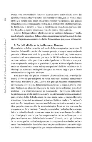 Donde se ve como soldados franceses intentan serrar por la mitad a través del eje axial, comenzando por el pubis, a un hombre desnudo, con las piernas hacia arriba y la cabeza hacia abajo. Imágenes dolorosas y despiadadas que quedan reflejadas del modo más cruento posible. En el conflicto hubo batallas terribles. La desolación, el hambre, la ruina, la pestilencia se extendieron por todas partes, dejando a la muerte como único remedio posible (Corral, 2005). A través de Goya pudimos adentrarnos en los territorios del pecado, y es ahí, donde el sueño angustioso de la desolación permanece impasible, donde los hermanos Chapman, encontraron el eslabón de una cadena que parece no tener fin. 3. The Hell: el infierno de los Hermanos Chapman El pronóstico se había cumplido y el sueño de la razón produjo monstruos. El dormitar del sentido común y la sinrazón produjo el mayor monstruo jamás pensado: el Holocausto nazi. La gran crisis económica del 29 y la consecuente retirada del mercado exterior por parte de EEUU acabó convirtiéndose en un buen caldo de cultivo para la ascensión al poder de las dictaduras europeas. Una autopista sin peaje para el partido nazi, que se alzó con el poder instaurando en Alemania un Tercer Reich y aunque había indicios suficientes de la ideología de hitleriana, nadie podía imaginar en torno a 1943 lo que el futuro más inmediato le deparaba a Europa. Este horror fue a lo que los Hermanos Chapman llamaron The Hell (el infierno) y sobre el que trabajaron en varias ocasiones, haciendo menciones y referencias muy claras a Goya. La obra a la que aquí hacemos referencia trata directamente sobre el tema de la masacre nazi durante la Segunda Guerra Mundial. Realizada en el año 2000, consta de nueve piezas colocadas a modo de esvástica — si la observamos desde un plano cenital — Se presenta cada una de las piezas con un cristal protector, en cuyo interior apreciamos una especie de gran portal de Belén de los horrores. En estas nueve piezas se narran diferentes situaciones como si de un via crucis se tratara. Su título es claro: “el infierno”, aquí suceden sanguinarias escenas: canibalismo, asesinatos, muertes, incendios, penuria… una sucesión de acontecimientos donde se nos muestran las consecuencias de la barbarie. “Las cabezas cortadas y colgadas, la venganza, la ira, la violación, las ejecuciones en masa, los campos sembrados de cadáveres, el castigo y la muerte que Goya supo describir con un realismo que recogía todo el dramatismo de la barbarie humana” (Francés, 2004: 15). Cada una de las escenografías y todas las figuras que la componen han sido elaboradas a mano siendo el nivel de detalle bastante alto para el diminuto tamaño de algunas de ellas. Un nivel de precisión que aumenta el realismo en la recreación de