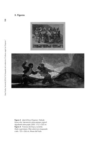 Figura 3 ∙ Jake & Dinos Chapman. Nobody knows why. Intervención sobre estampa original. Aguafuerte sobre papel, 2003. 17,2 × 222 cm. Figura 4 ∙ Francisco de Goya y Lucientes. Duelo a garrotazos. Óleo sobre muro traspasado a tela. 123 × 266 cm, Museo del Prado.