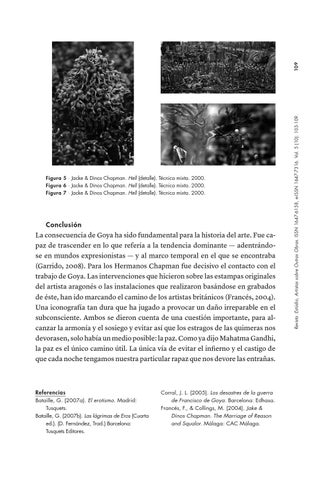 Conclusión La consecuencia de Goya ha sido fundamental para la historia del arte. Fue capaz de trascender en lo que refería a la tendencia dominante — adentrándose en mundos expresionistas — y al marco temporal en el que se encontraba (Garrido, 2008). Para los Hermanos Chapman fue decisivo el contacto con el trabajo de Goya. Las intervenciones que hicieron sobre las estampas originales del artista aragonés o las instalaciones que realizaron basándose en grabados de éste, han ido marcando el camino de los artistas británicos (Francés, 2004). Una iconografía tan dura que ha jugado a provocar un daño irreparable en el subconsciente. Ambos se dieron cuenta de una cuestión importante, para alcanzar la armonía y el sosiego y evitar así que los estragos de las quimeras nos devorasen, solo había un medio posible: la paz. Como ya dijo Mahatma Gandhi, la paz es el único camino útil. La única vía de evitar el infierno y el castigo de que cada noche tengamos nuestra particular rapaz que nos devore las entrañas.