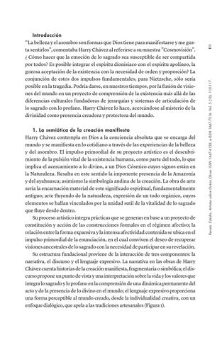 1. La semiótica de la creación manifiesta Harry Chávez contempla en Dios a la conciencia absoluta que se encarga del mundo y se manifiesta en lo cotidiano a través de las experiencias de la belleza y del asombro. El impulso primordial de su proyecto artístico es el descubrimiento de la pulsión vital de la existencia humana, como parte del todo, lo que implica el acercamiento a lo divino, a un Dios Cósmico cuyos signos están en la Naturaleza. Resalta en este sentido la imponente presencia de la Amazonía y del ayahuasca; asimismo la simbología andina de la creación. La obra de arte sería la encarnación material de este significado espiritual, fundamentalmente antiguo; arte fluyendo de la naturaleza, expresión de un todo orgánico, cuyos elementos se hallan vinculados por la unidad sutil de la vitalidad de lo sagrado que fluye desde dentro. Su proceso artístico integra prácticas que se generan en base a un proyecto de constitución y acción de las construcciones formales en el régimen afectivo; la relación entre la forma expansiva y la intensa afectividad contenida se ubica en el impulso primordial de la enunciación, en el cual conviven el deseo de recuperar visiones ancestrales de lo sagrado con la necesidad de participar en su revelación. Su estructura fundacional proviene de la interacción de tres componentes: la narrativa, el discurso y el lenguaje expresivo. La narrativa en las obras de Harry Chávez cuenta historias de la creación manifiesta, fragmentaria o simbólica; el discurso propone un punto de vista y una interpretación sobre la vida y los valores que integra lo sagrado y lo profano en la comprensión de una dinámica permanente del acto y de la presencia de lo divino en el mundo; el lenguaje expresivo proporciona una forma perceptible al mundo creado, desde la individualidad creativa, con un enfoque dialógico, que apela a las tradiciones artesanales (Figura 1).