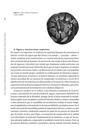 4. Signos y construcciones expresivas En cuanto a la expresión, se evidencia la capacidad humana de exteriorizar su interior a través de signos que dan forma a un mundo — concepto — afecto — visión, mediante la de-construcción y re-construcción de las representaciones de la memoria del ser humano. Se provoca de este modo el deseo del observador de ingresar y descubrir este mundo que finalmente podrá confrontar con su propio mundo personal. Nietzsche decía que el sueño, al generar su mundo, nos permite conocernos mejor y así liberarnos de los límites que nos impedían ver. Crear un mundo propio, mediante la condensación de dinámicas expresivas que relacionan el exterior y el interior humano, se constituye siguiendo la misma necesidad del ser humano de comprender su existencia a través de la significación de sus experiencias almacenadas en la memoria. Para el artista, la experiencia del ayahuasca integra los diversos elementos culturales, para enfocar la permanencia de la revelación en lo cotidiano (Figura 6). El proceso creativo no se reduce a una dinámica productiva de la pervivencia y articulación de una diversidad de signos, exponentes simbólicos de lecturas culturales de la divinidad. Aunque desde el inicio sorprende la modalidad escogida, el uso de piedras y perlas de fantasía, stickers, cuentas, mostacillas y otros elementos, que se ensamblan en un minucioso trabajo de armar imágenes, lo significativo es la razón de ser de esta modalidad y sus implicaciones. En el modo artesanal del ensamblaje perdura la importancia del acto creativo, en que concepto, emoción y dedicación manual son parte de un proceso de iniciación que el creador recorre, para llegar a la sensación de comprensión de la unidad en la diversidad, al enunciado fundamental de la existencia, en que ser de manera plenaria implicaría comprender la totalidad a través de la esencia. Pero no de manera abstracta, sintética y razonadora, sino de manera sensorial, desde el