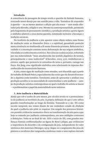 Introdução A consciência da passagem do tempo revela a questão da finitude humana, evocando nosso desejo por um sentido para a vida. Tentativas de responder à questão — ou ao menos atenuar a aflição que ela evoca — vem sendo ofertadas pela filosofia, religião e arte. Mesmo na contemporaneidade, permeada pela hegemonia do pensamento científico, a produção artística aporta signos e símbolos relativos a essa eterna questão, remetendo inclusive a heranças e tradições arcaicas. No território da joalheria a joia aparece como objeto mítico, uma forma de mediação entre as dimensões física e a espiritual, garantindo proteção nesta existência ou sinalizando a fé numa dimensão póstuma. Relacioná-la à vaidade e à ostentação consiste numa deformação de sua origem simbólica, vinculada ao conhecimento esotérico. Nas ciências ocultas as joias, sobretudo por sua materialidade “mais amadurecida (no sentido alquímico do termo), principalmente o ouro inalterável” (Chevalier, 2003: 522), simbolizavam o ctónico, aquilo que pertencia às entranhas da terra e, portanto, carrega sua força. Em Jung, esse significado simbólico esta relacionado às riquezas desconhecidas do inconsciente humano. A joia, como signo de mediação entre mundos, será discutida aqui a partir do trabalho de Ruudt Peters, especialmente das series que ele desenvolveu tendo a alquimia como temática. Entretanto, antes de apresentar e analisar essa produção acredita-se na necessidade de contextualizar a arte-joalheria — campo da produção artística contemporânea no qual o trabalho do artista se insere — e problematizar o papel da materialidade neste universo.