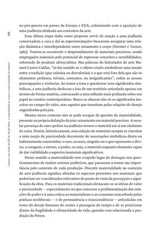 no pós-guerra em países da Europa e EUA, culminando com a aparição de uma joalheria alinhada aos contextos da arte. Essa última etapa tinha como proposta servir de reação a uma joalheria conservadora e cara e daí as experimentações buscavam assegurar uma relação dinâmica e interdependente entre ornamento e corpo (Dormer e Turner, 1985). Tornou-se recorrente o desprendimento de materiais preciosos, sendo empregados materiais pelo potencial de expressar conceitos e sensibilidades, sobretudo de produzir afetos/afetar. Nas palavras do historiador de arte Manuel Castro Caldas, “só faz sentido se o objeto criado estabelecer uma tensão entre a tradição (que valoriza ou desvaloriza) e o que está fora dela que são os elementos profanos, triviais, correntes, ou insignificantes”, enfim as nossas preocupações e vivências. Ao trazer a tona e questionar seus significados simbólicos, a arte-joalheria deslocou a joia de um território articulado apenas em termos de forma-matéria, convocando a uma reflexão mais profunda sobre seu papel no cenário contemporâneo. Busca-se abarcar não só os significados inscritos no campo do valor, mas aqueles que transitam pelas relações do desejo engendradas pela joia. Mesmo nesse contexto não se pode escapar da questão da materialidade, presente na própria definição da joia: ornamento em material precioso. A secular presença de ouro-pedras na joalheira tornou o material em si um sinônimo da coisa. Porém, historicamente, essa seleção de materiais sempre se vinculou a uma noção de preciosidade decorrente de associações simbólicas direta ou indiretamente construídas: o raro, escasso, singular ou o que representa o divino, a coragem, o eterno, o poder, ou seja, o material enquanto elemento capaz de dar visibilidade a aspectos imateriais significativos. Nesse sentido a materialidade tem ocupado lugar de destaque nos questionamentos de muitos artistas joalheiros, que passaram a tomar sua importância pelo contexto de cada produção. Discutir materialidade no contexto da arte-joalheria significa abordar os aspectos presentes nos materiais que poderiam ser considerados relevantes do ponto de vista da percepção e significação da obra. Para os materiais tradicionais destacam-se as ideias de valor e preciosidade — especialmente no que concerne a problematização das relações de poder e à uma critica ao materialismo e ao consumo exacerbado pelas práticas neoliberais — e de permanência e transcendência — articuladas em torno do desejo humano de conter a passagem do tempo e de se posicionar diante da fragilidade e efemeridade da vida, questão esta relacionada a produção de Peters.